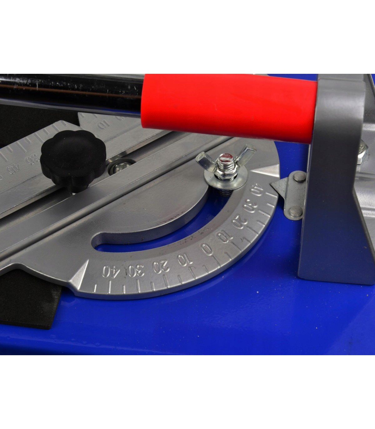 Dokładna podziałka pozwala na precyzyjne cięcie określonej szerokości płytki. Przyrząd posiada możliwość cięcie płytek pod dowolnym kątem dzięki ruchomemu kątownikowi.