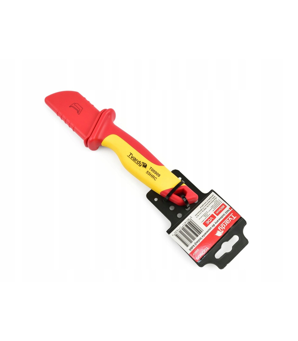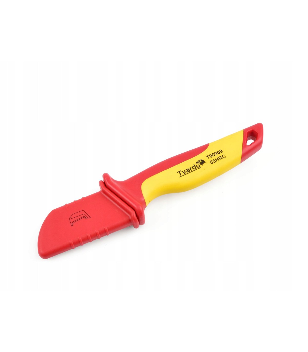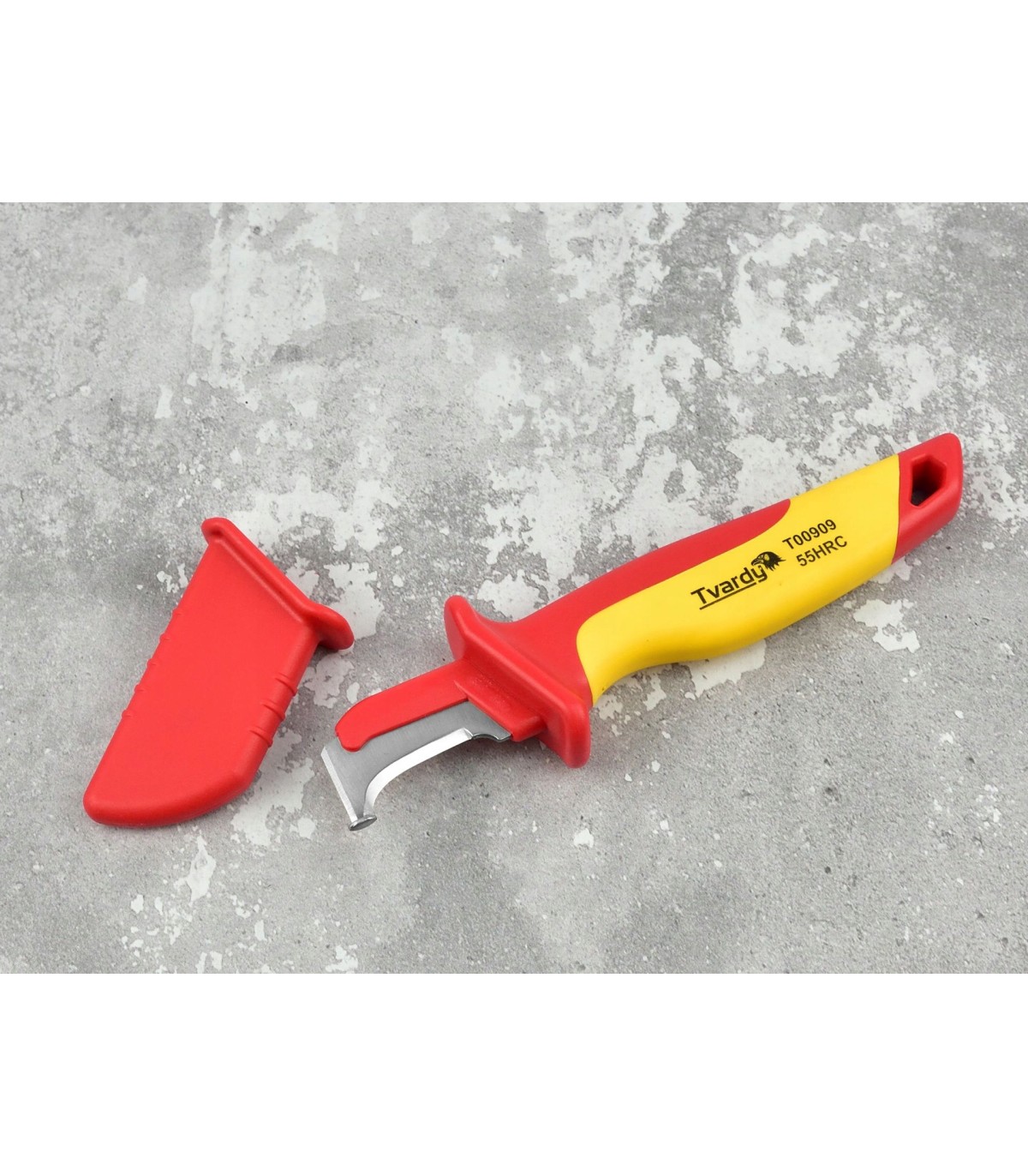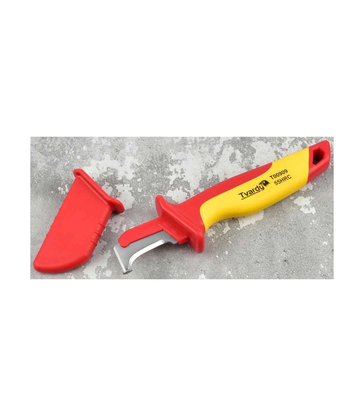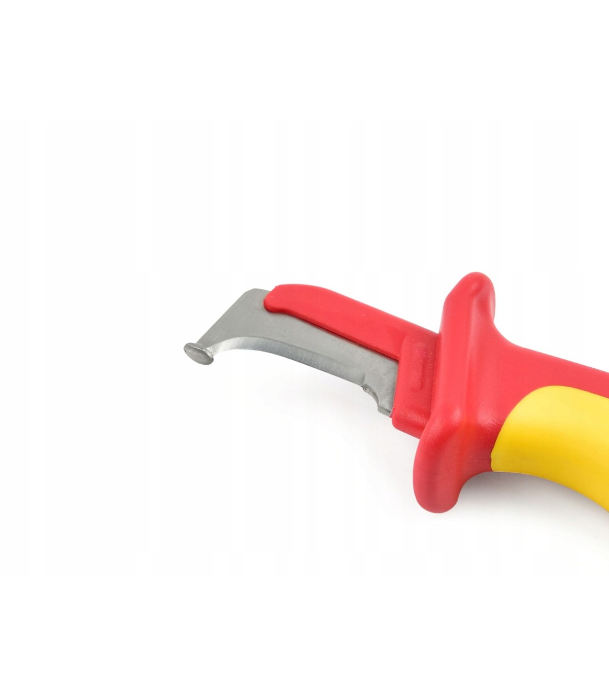 Nóż izolowany VDE 1000V przeznaczony do ściągania izolacji. Ergonomiczna, wielokomponentowa rękojeść zapewnia skuteczną izolacje do 1000V. Doskonale sprawdzą się podczas wykonywania wszelkiego rodzaju prac przy instalacjach niskonapięciowych. Sierpowate ostrze wykonane ze stali nierdzewnej 3Cr13 poddanej odpowiedniej obróbce cieplnej w celu uzyskania optymalnej twardości na poziomie 55 HRC. Ostrze zakończone stopką ślizgową ułatwiającą ściąganie izolacji.