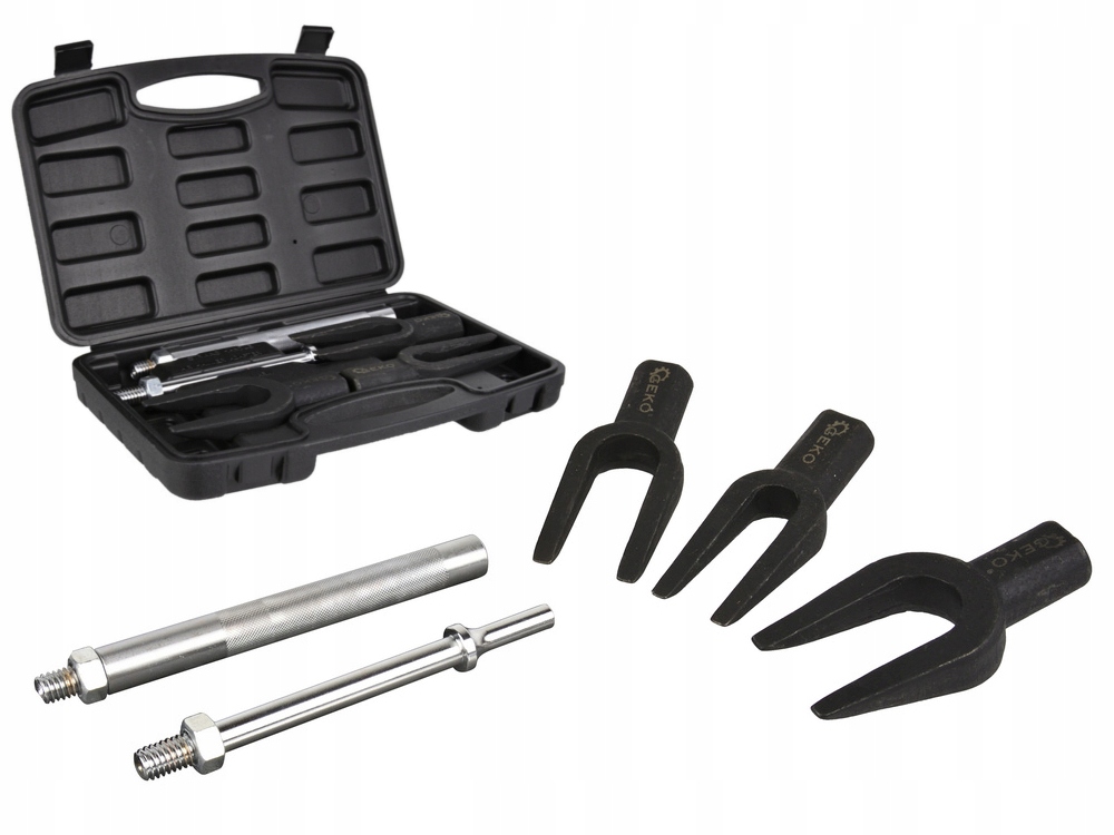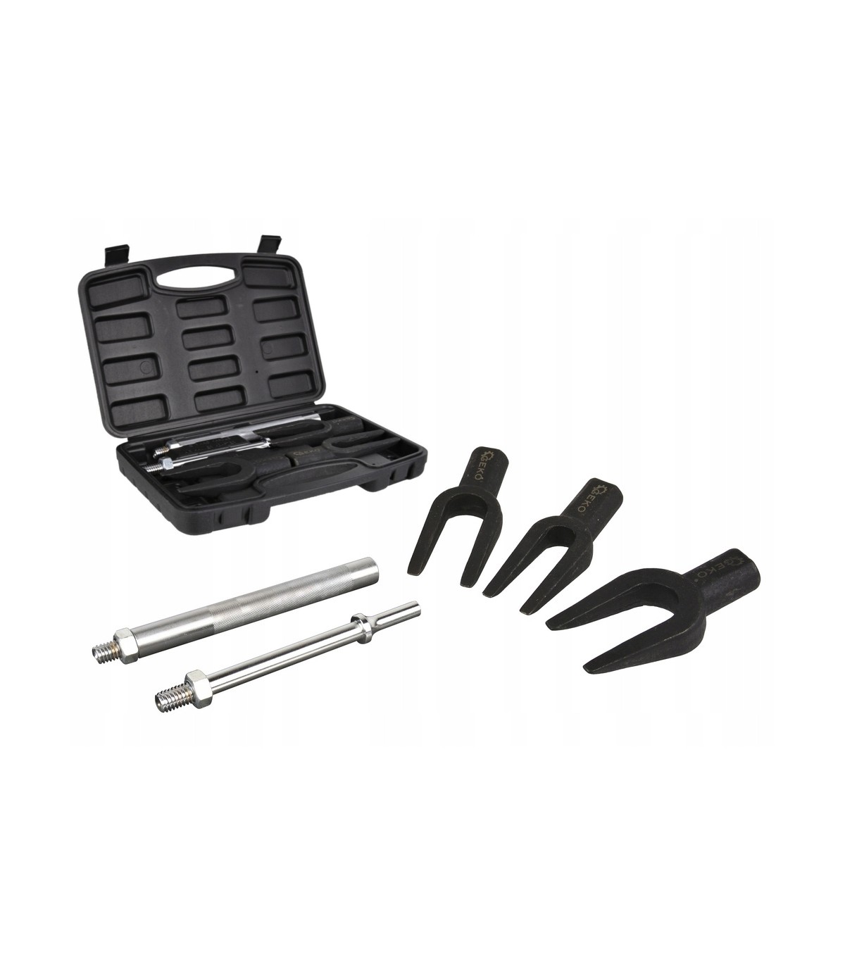 Zestaw ściągaczy widełkowych do drążków kierowniczych i sworzni kulkowych wykonany ze stali chromowo-wanadowej (CrV). Zestaw zawiera trzy ściągacze widełkowe o szerokości wewnętrznej 28, 24, 17 mm oraz dwie rękojeści do dociskania, przystosowane do pracy z młotkiem pneumatycznym lub ręcznym. Ramiona widełek ściągacza posiadają trwałe i równe powierzchnie klinowe pozwalające na łatwe i precyzyjne umocnienie sworzni kulkowych oraz drążków kierowniczych.