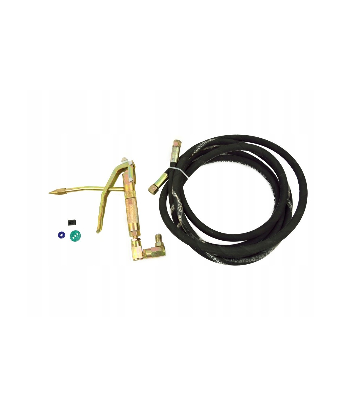 W zestawie znajduje się wąż ciśnieniowy i pistolet (obrotowy).