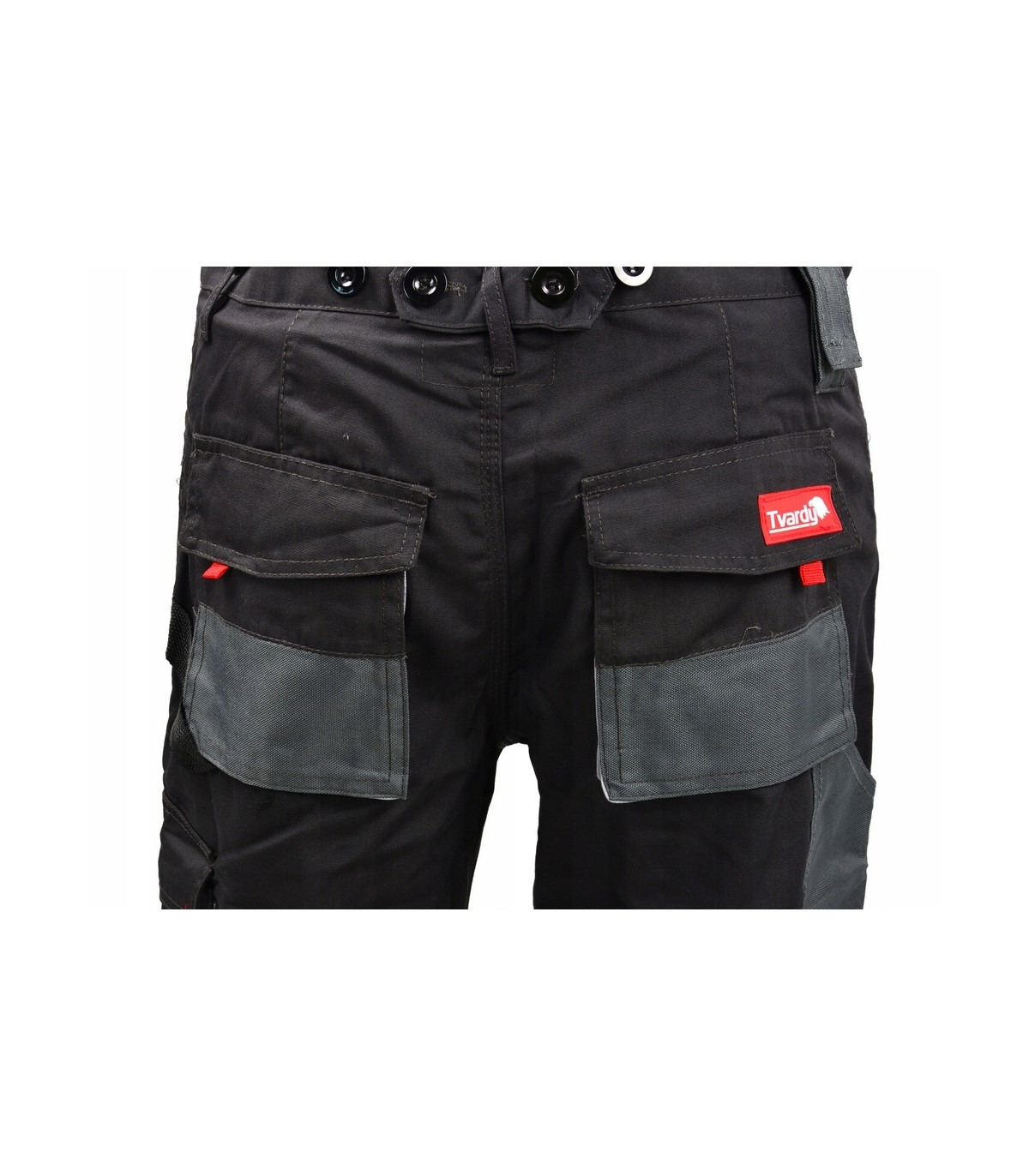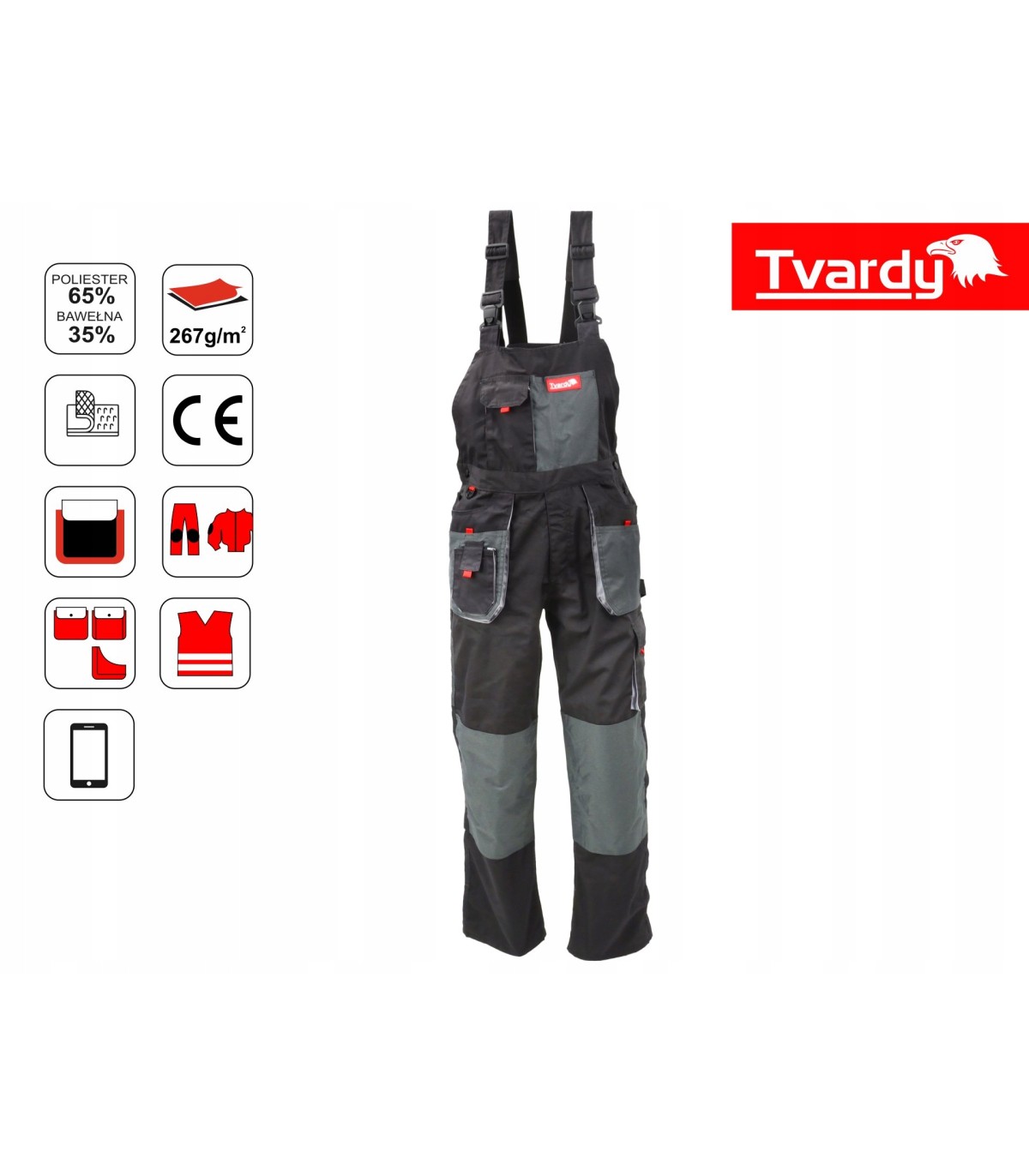 Spodnie robocze na szelkach profesjonalnej Polskiej marki TVARDY. Wykonane z wysokiej jakości materiału dodatkowo wzmocnionego w miejscach narażonych na przetarcia. Spodnie idealnie sprawdzą się podczas wszelkiego rodzaju prac domowych jak i profesjonalnych. Posiadają 11 funkcjonalnych kieszeni w tym 8 zapinanych na rzep. Dzięki dodatkowym wzmocnieniom kieszenie wytrzymują duże obciążenie. Spodnie wyposażone w kieszeń na smatrphone'a w miejscu najmniej narażonym na uszkodzenie. Posiadają wygodne szelki zapewniające komfort podczas pracy.