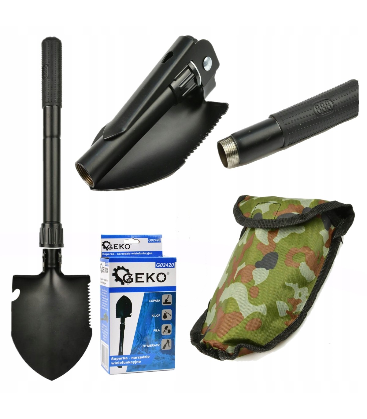 ✅ Wielofunkcyjna składana saperka 4w1. Narzędzie niezwykle przydatne na biwaku, podczas wypadów do lasu. Dzięki możliwości złożenia saperka zajmuje bardzo mało miejsca, dzięki czemu zostanie doceniona przez survivalowców, osoby chodzące z wykrywaczami metali oraz przez miłośników OffRoad’u. Wykonana z wytrzymałej stali węglowej zabezpieczonej przed korozją. Największą zaletą saperki są jej niewielkie wymiary, a także wielofunkcyjność. Może być wykorzystywana jako klasyczna saperka, a po lekkiej modyfikacji saperkę można zmienić w mini kilof. Część robocza saperki dodatkowo wyposażona została w piłę do drewna oraz otwieracz do butelek.