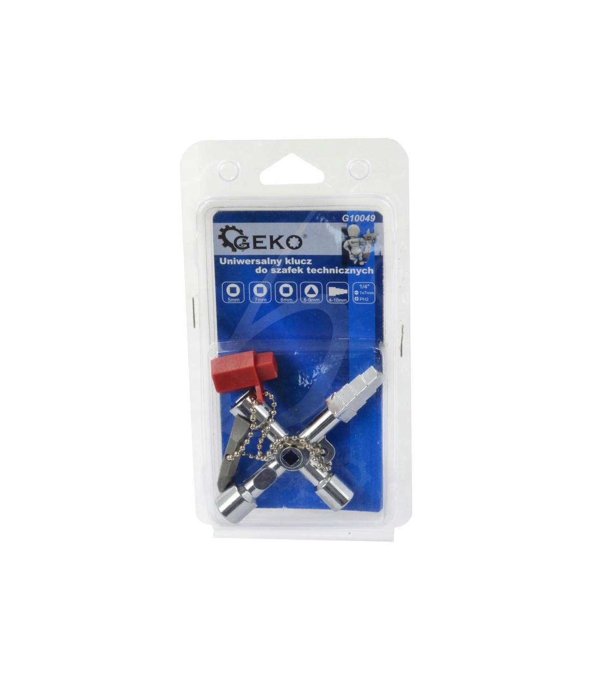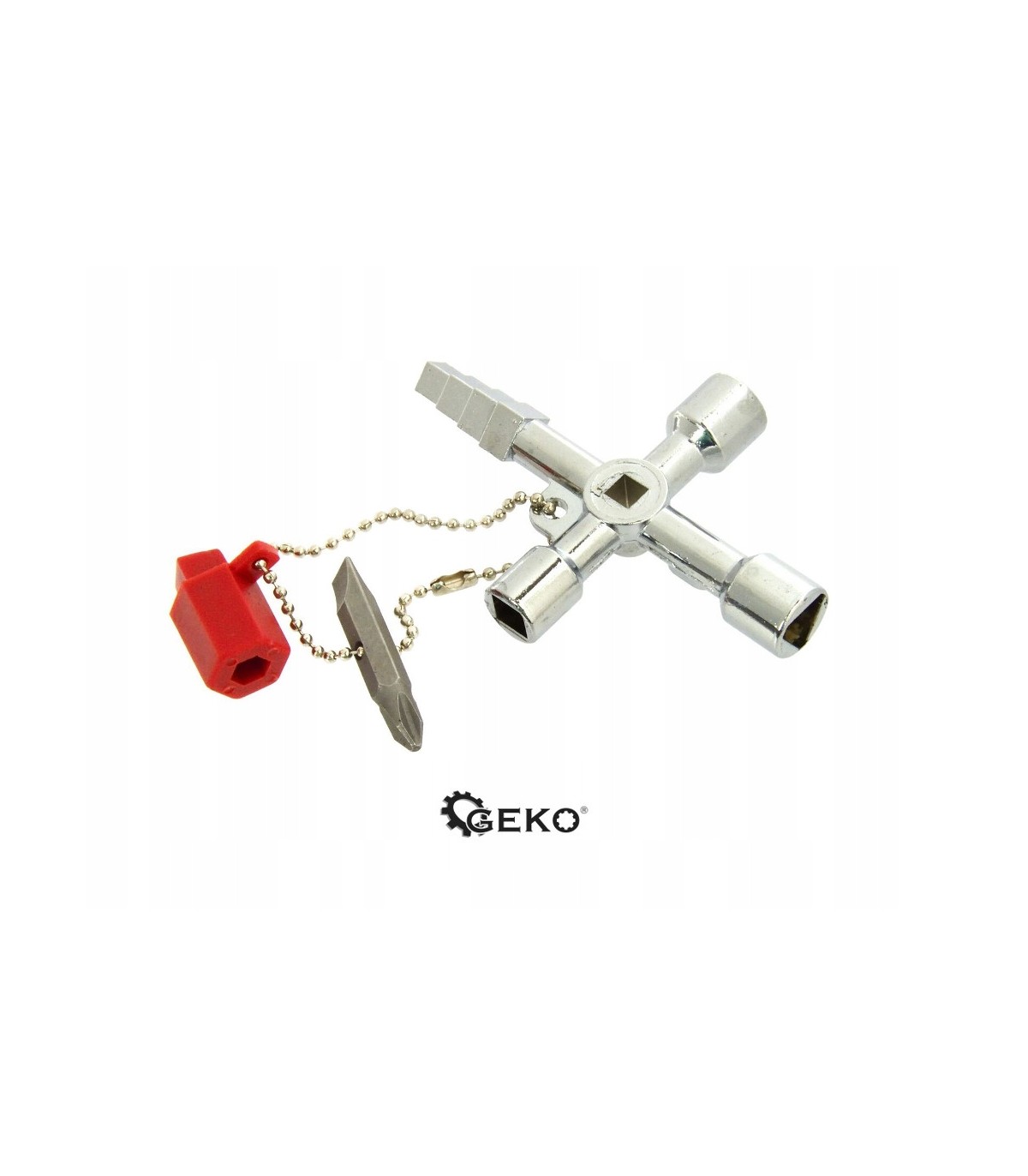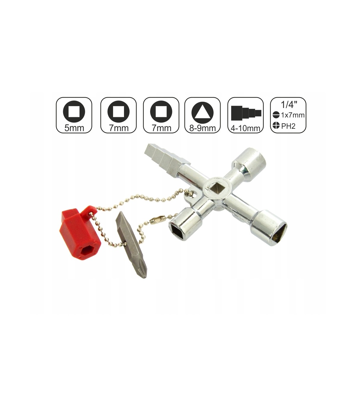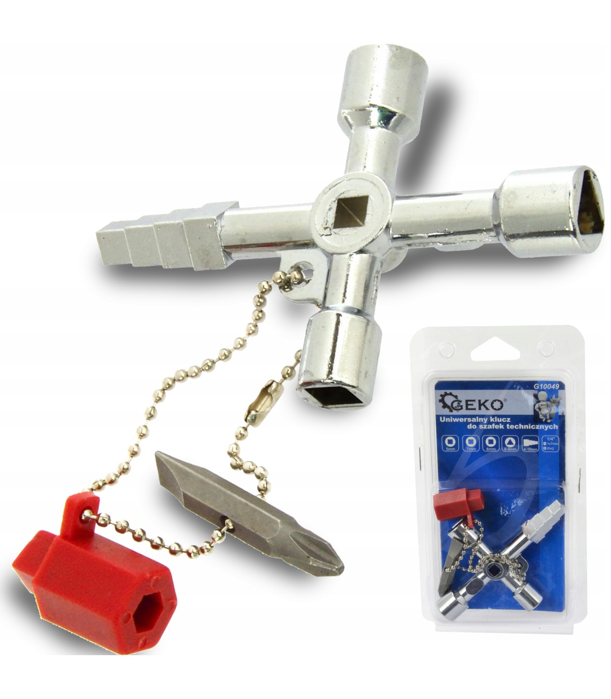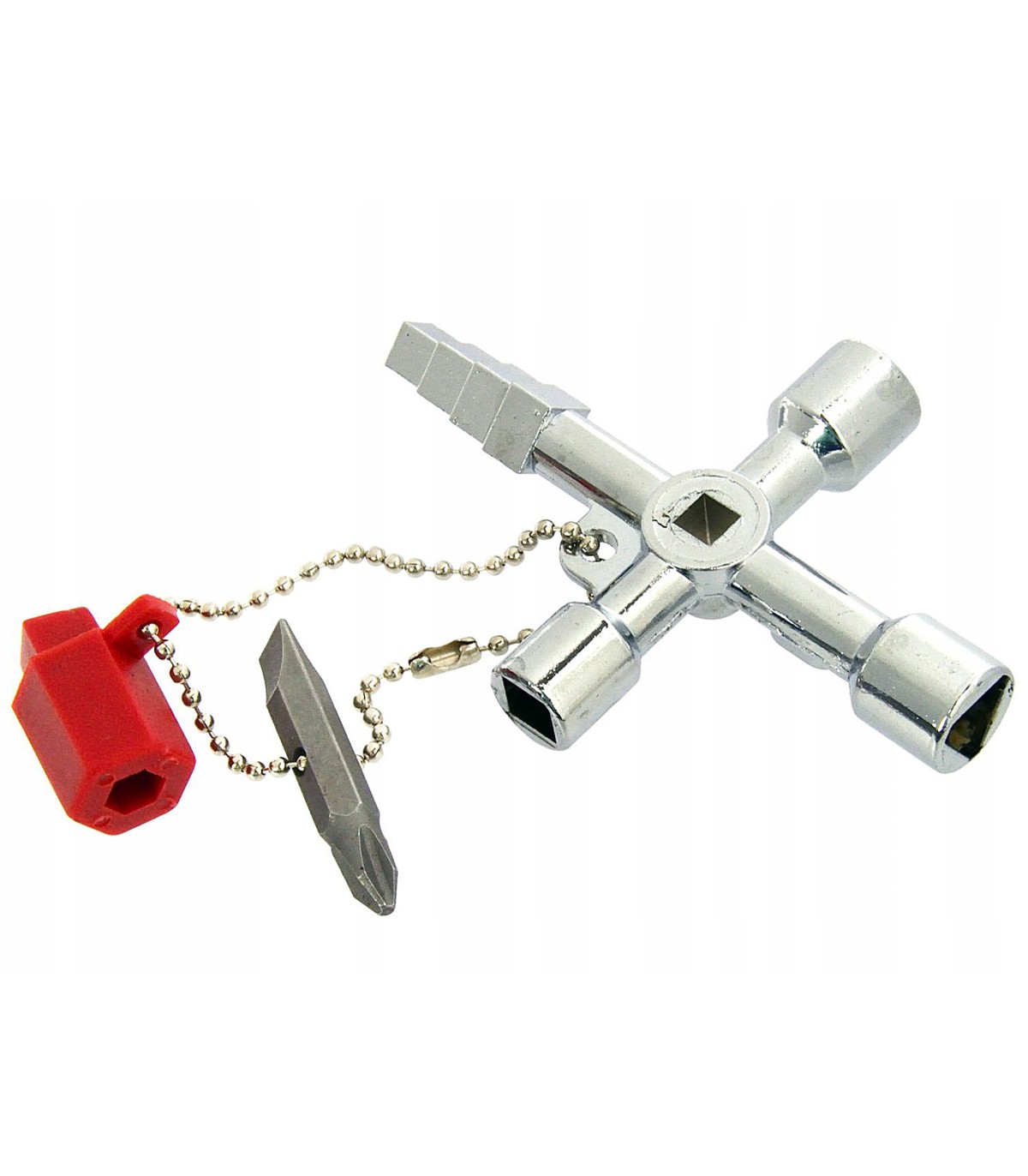 Uniwersalny klucz wyposażony w końcówki do otwierania i zamykania WIĘKSZOŚCI popularnych systemów SKRZYNEK oraz SZAF STEROWNICZYCH. Zamki tego typu stosuje się w instalacjach elektrycznych, grzewczych, sanitarnych, gazowych w windach oraz w wielu innych urządzeniach technicznych. Doskonale sprawdzi się zarówno w warunkach profesjonalnych jak i amatorskich.