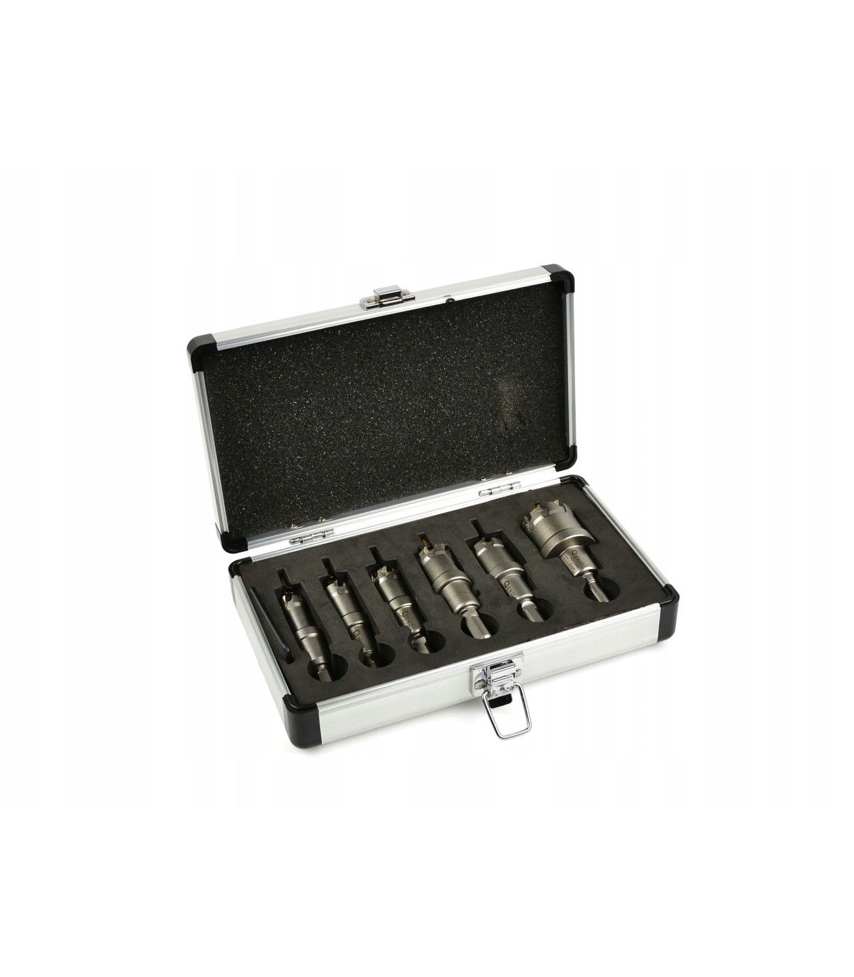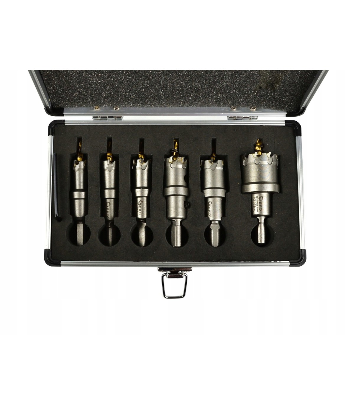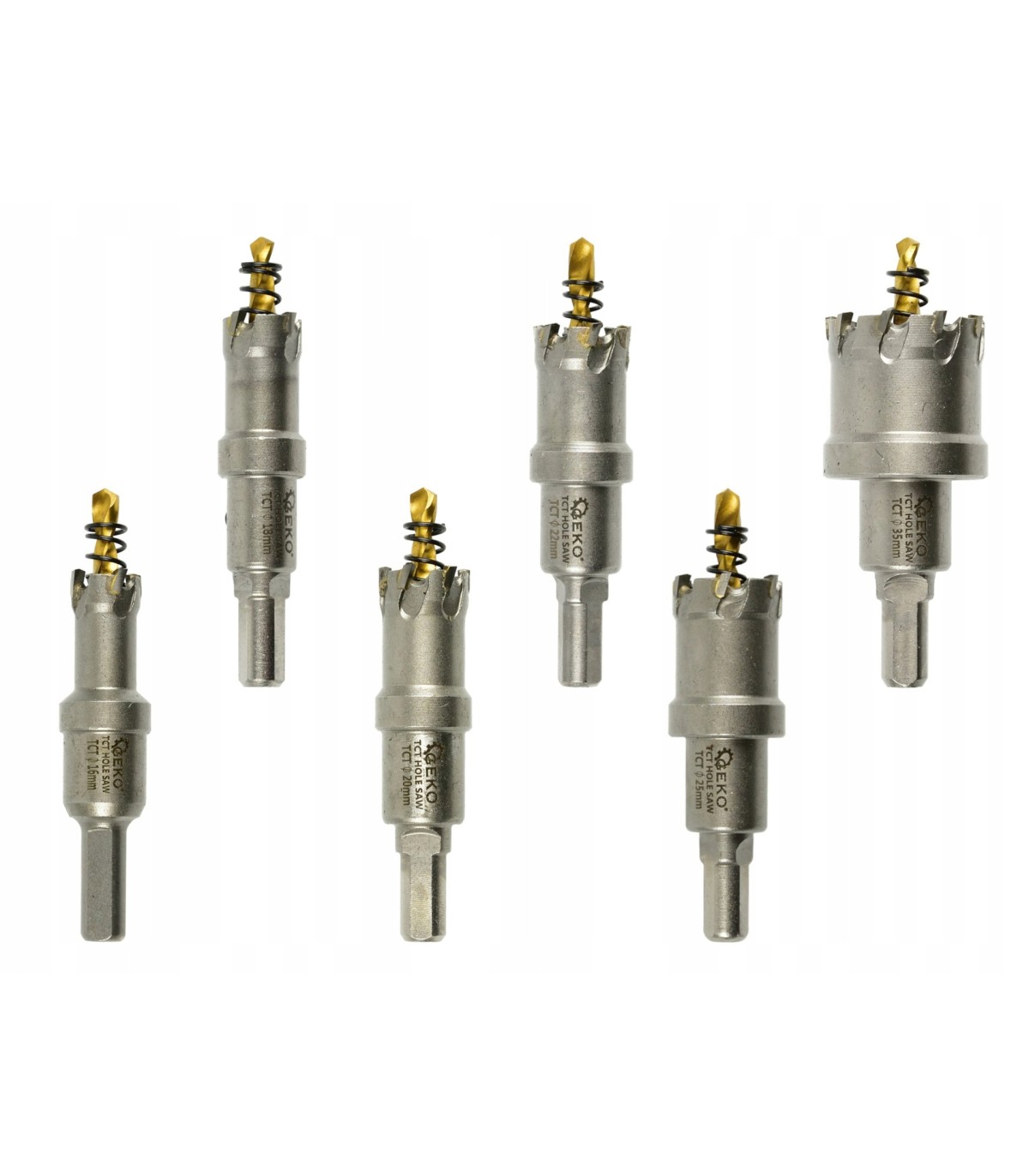 Zestaw 6 szt. otwornic TCT do metalu w rozmiarach 16-35mm. Ostrza wykonane z węglików spiekanych, które charakteryzują się znacznie większą twardością oraz odpornością na wysokie temperatury w porównaniu do stali szybkotnącej HSS. Przeznaczone do wykonywania większej średnicy otworów w stali, żeliwie, metalach kolorowych, drewnie, tworzywach sztucznych itp. Dla zwiększenia precyzji cięcia zastosowano wiertło prowadzące ze stali HSS. Sprężyna zamocowana na wiertle prowadzącym, pozwala w łatwy sposób usunąć urobek.