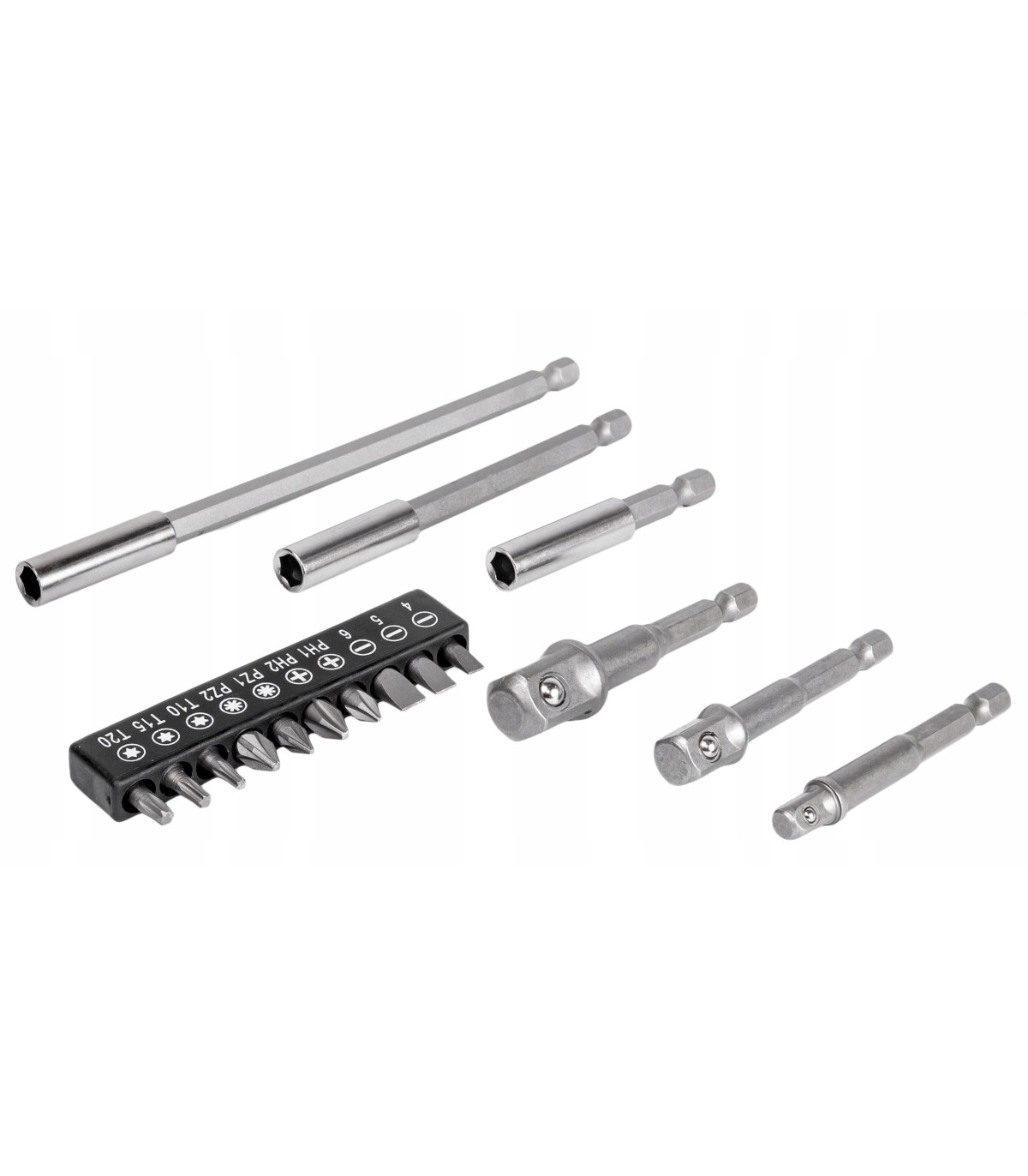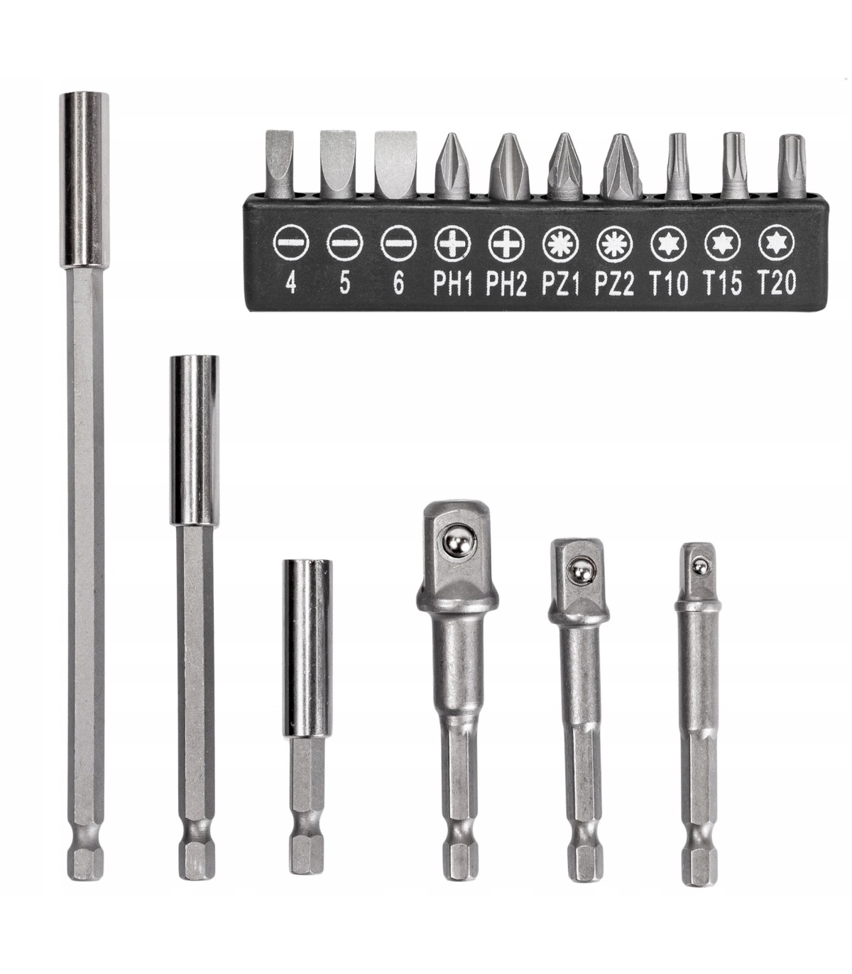⭐ Zestaw, który sprawdzi się zarówno w domowych, jak i profesjonalnych pracach. Zawiera 16 elementów, w tym bity, przedłużki i adaptery, które ułatwią wszelkie zadania związane z wierceniem i wkręcaniem.