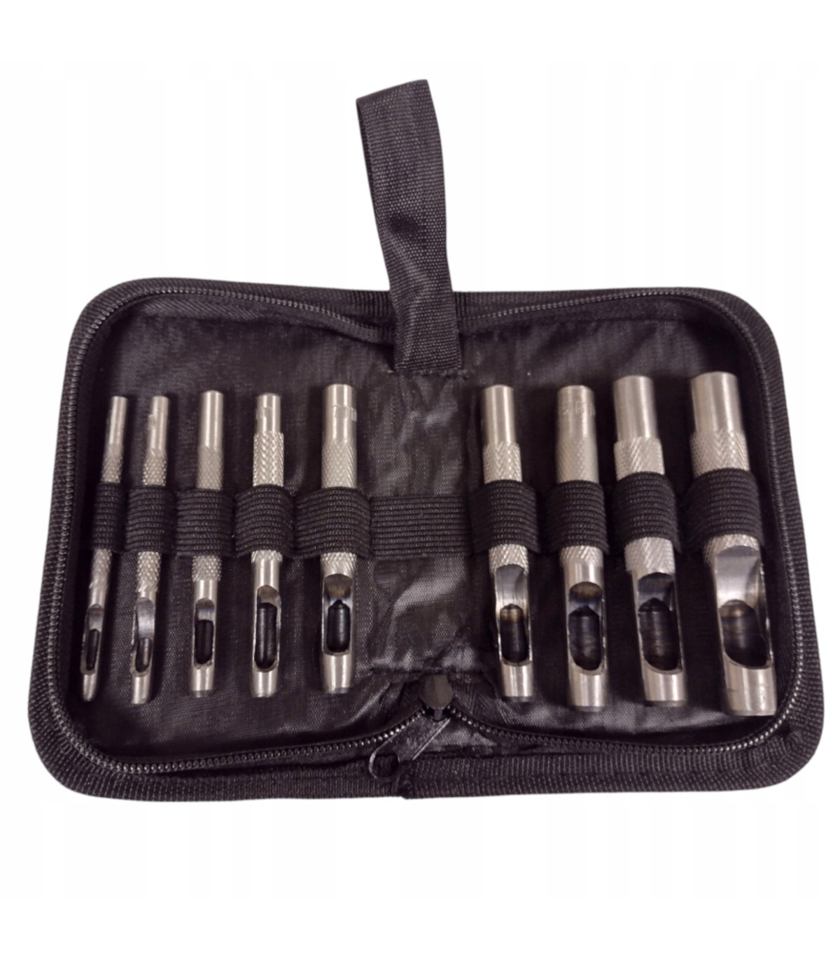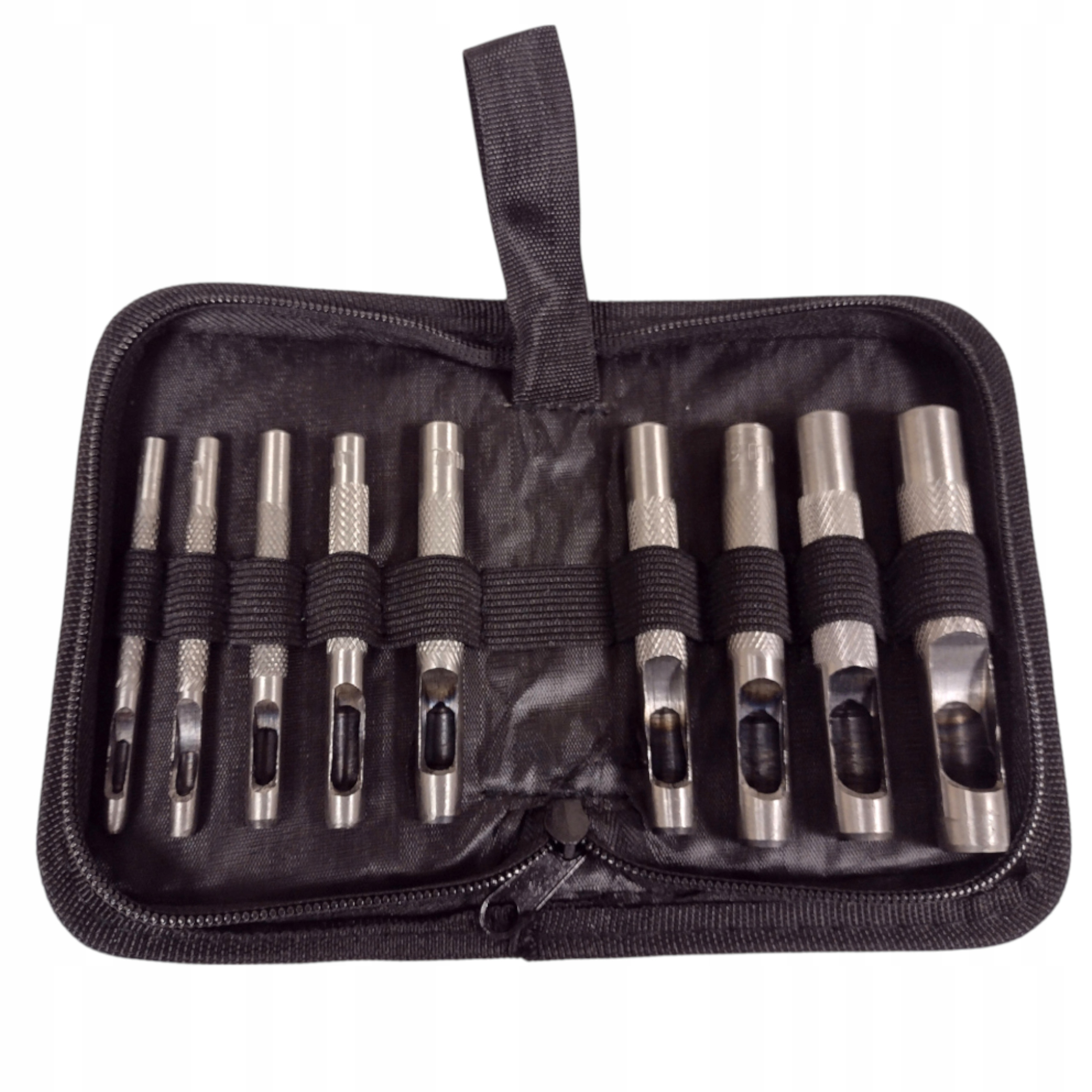 Praktyczny zestaw 9 przebijaków o średnicach od 3 do 12 mm, idealny do precyzyjnego dziurkowania skóry, gumy, kartonu oraz tworzyw sztucznych. Wykonane ze stali hartowanej, zapewniają trwałość i efektywność w pracy.