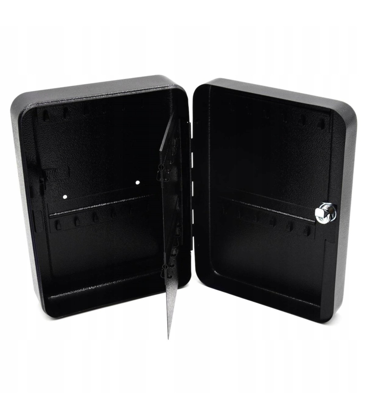 Wykonana z trwałego metalu, wyposażona w zamek zamykany na kluczyk (2 klucze w zestawie), gwarantuje bezpieczne i uporządkowane przechowywanie kluczy.