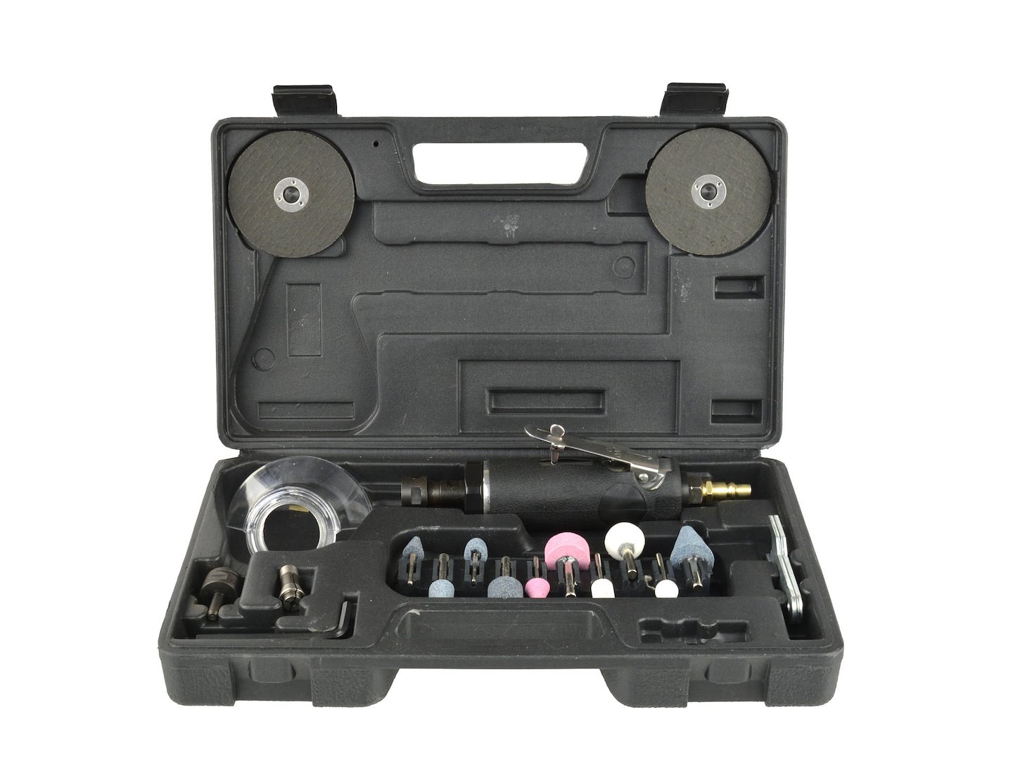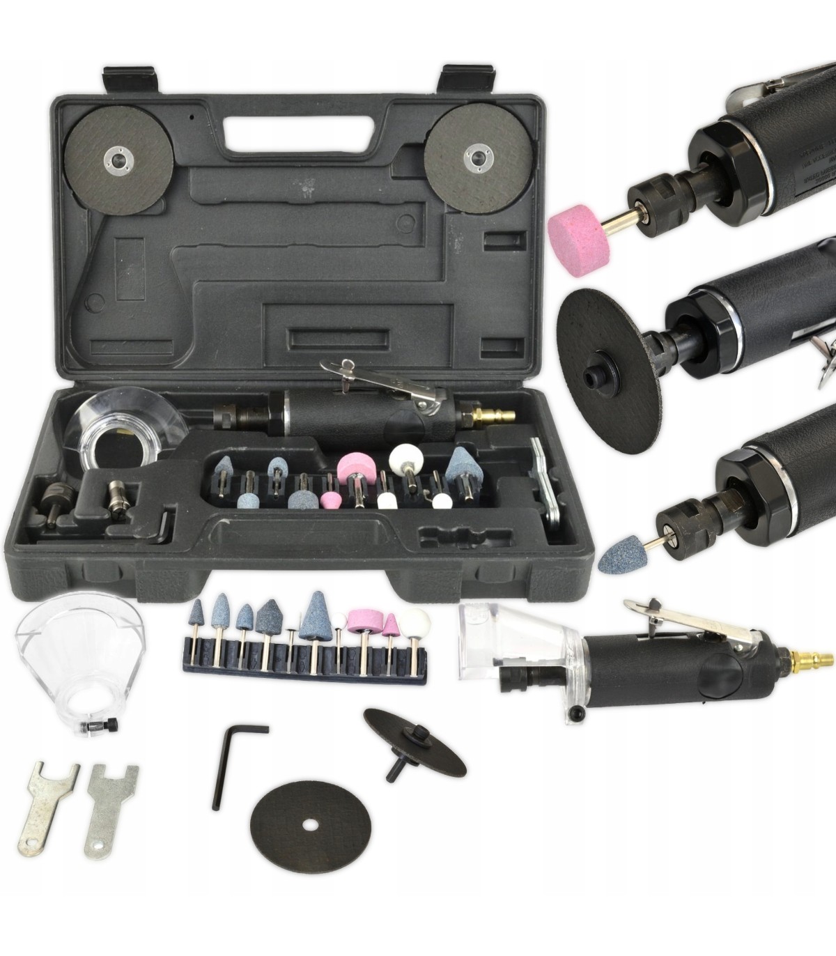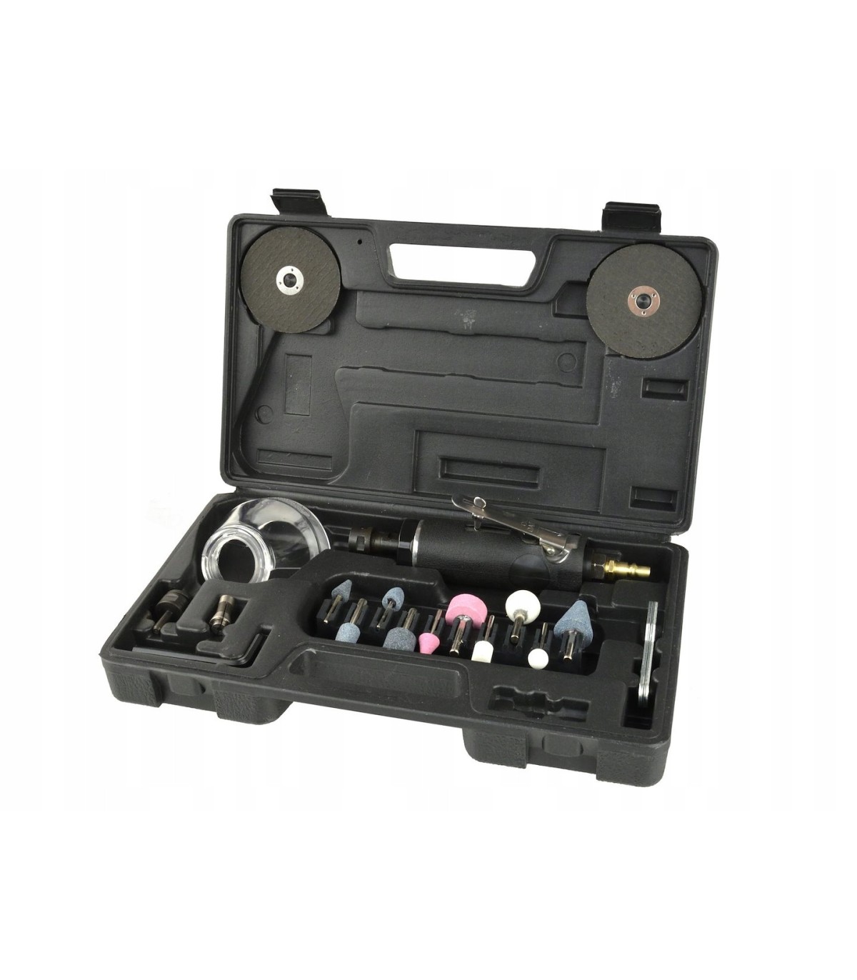 Wszechstronna szlifierka pneumatyczna trzpieniowa w zestawie z bogatym kompletem akcesoriów. Doskonała do cięcia, szlifowania i obróbki detali metalowych oraz innych materiałów. Kompaktowa, lekka i poręczna – idealna do pracy w trudno dostępnych miejscach.