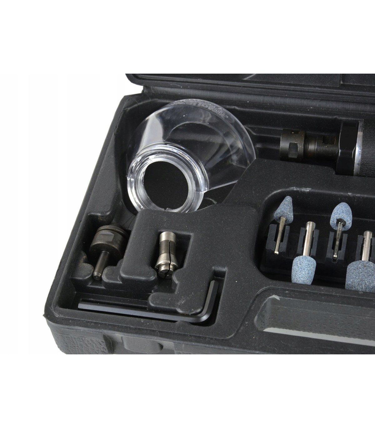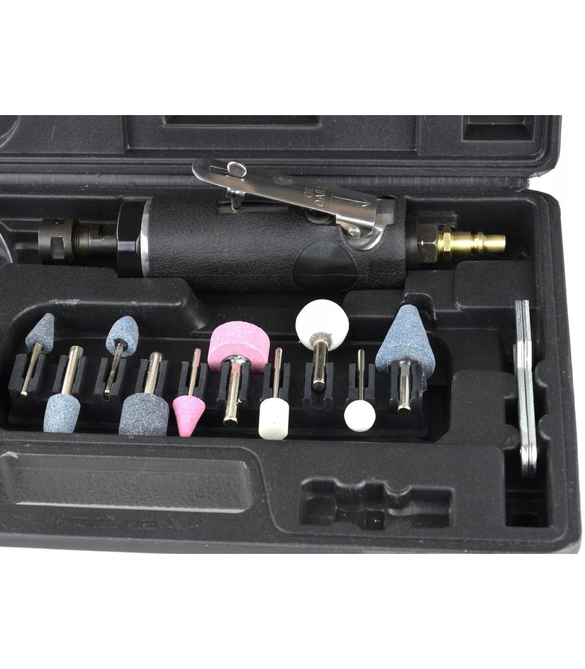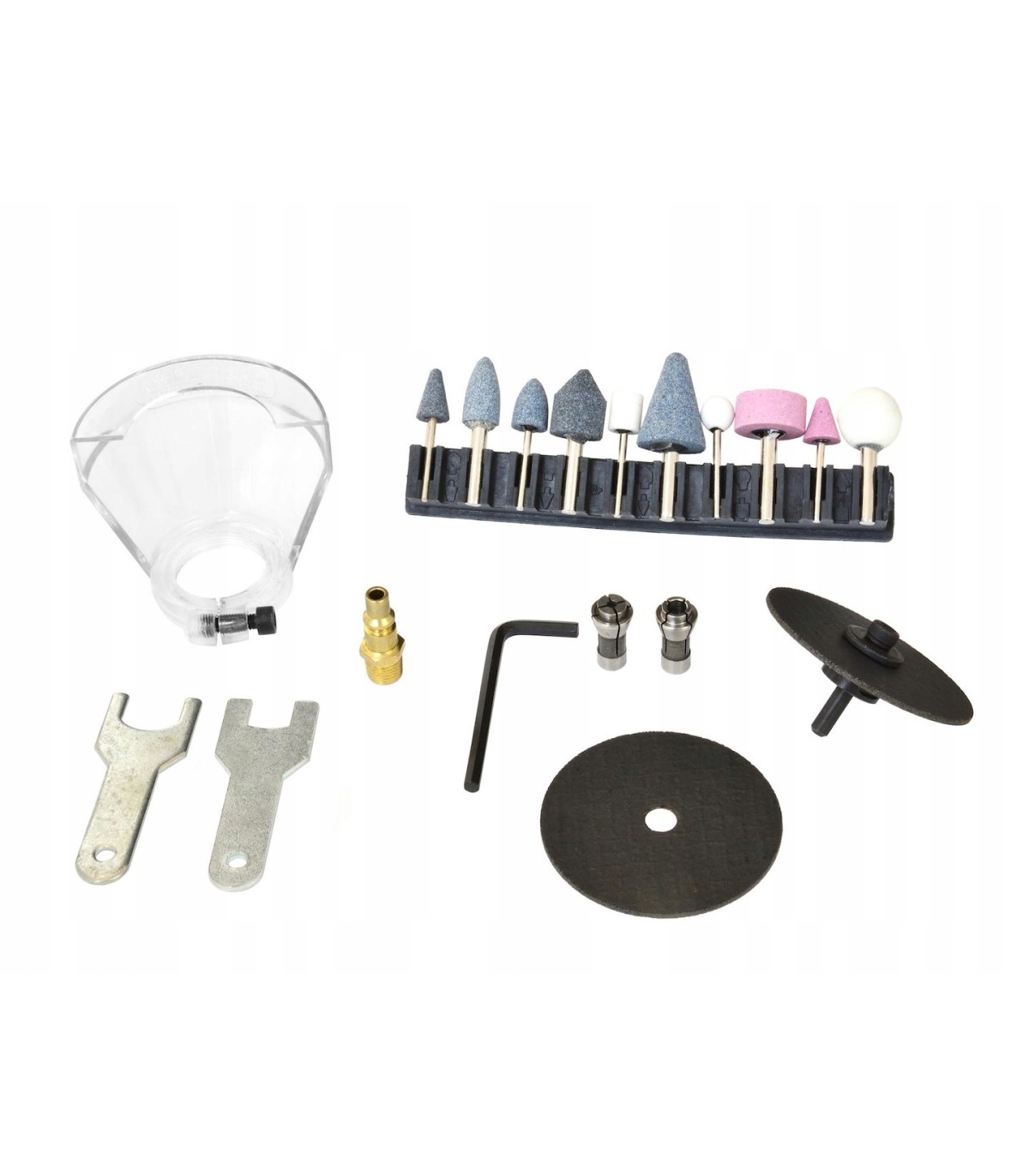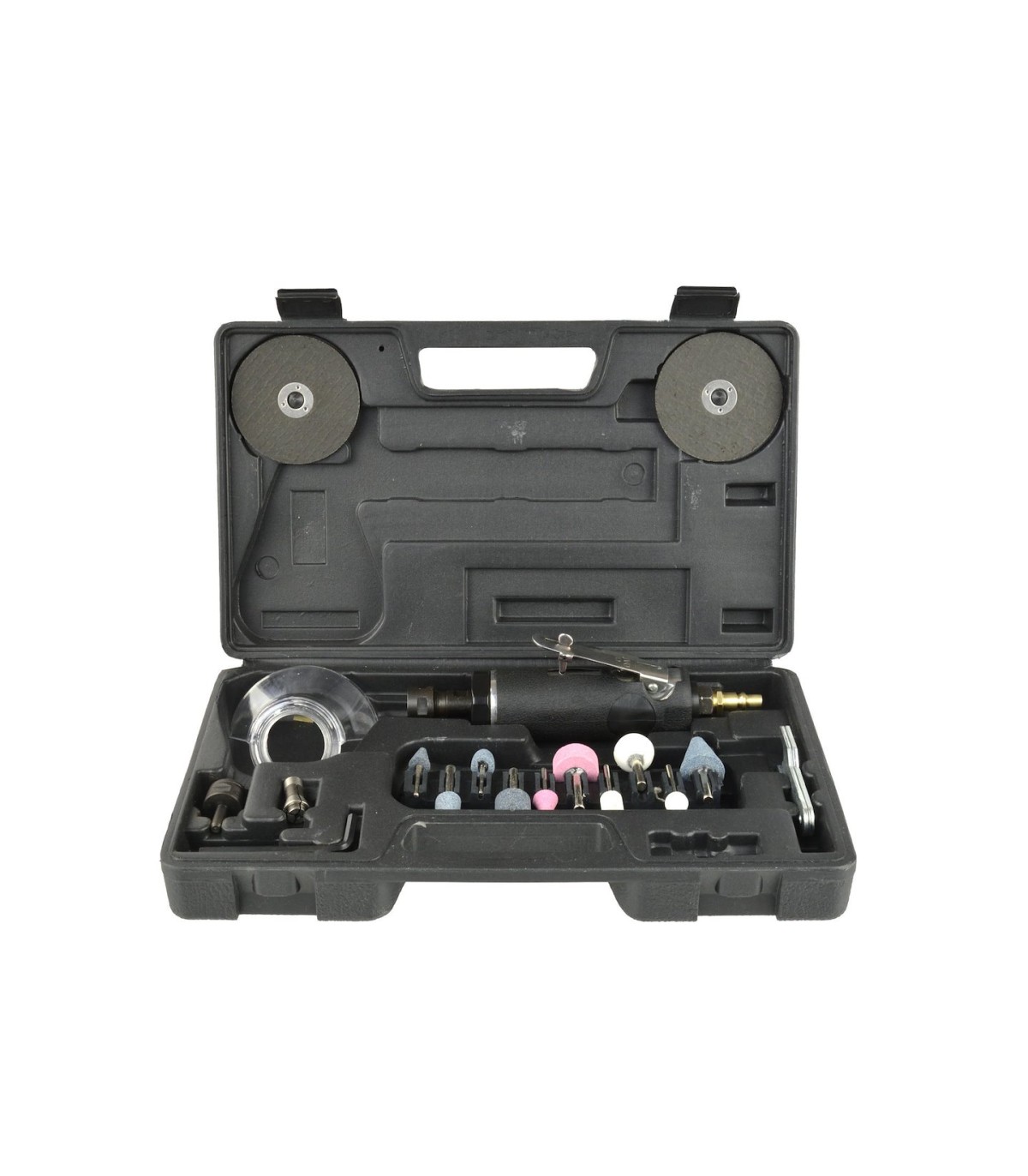 Wszechstronna szlifierka pneumatyczna trzpieniowa w zestawie z bogatym kompletem akcesoriów. Doskonała do cięcia, szlifowania i obróbki detali metalowych oraz innych materiałów. Kompaktowa, lekka i poręczna – idealna do pracy w trudno dostępnych miejscach.
