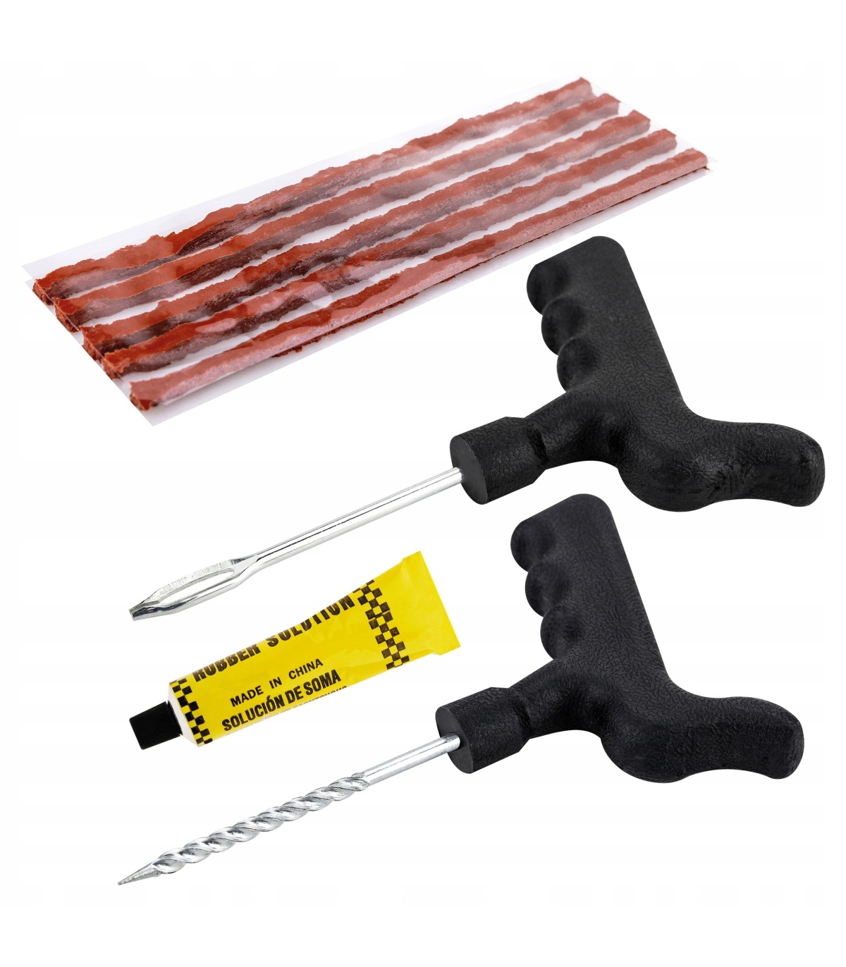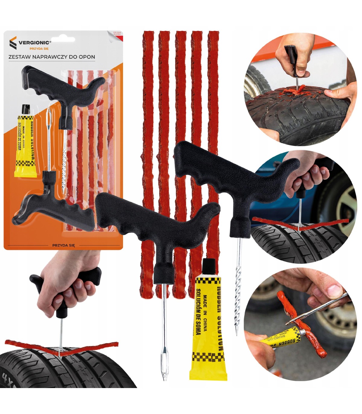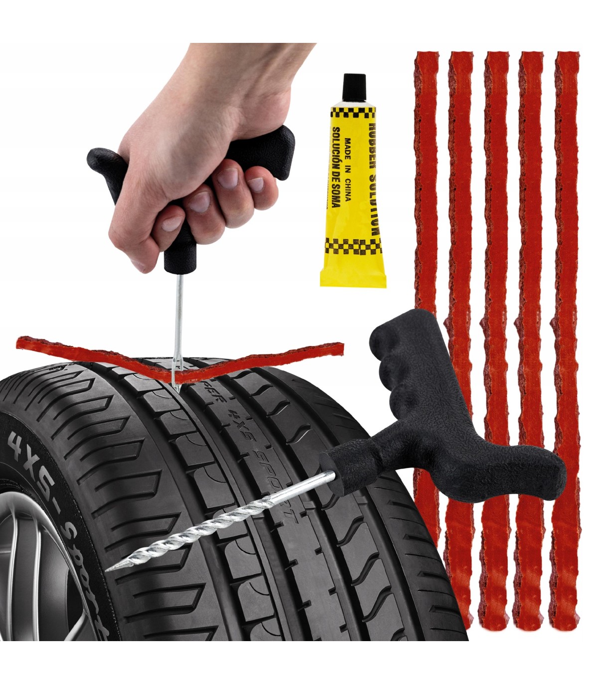 ✅ Dzięki niemu możliwa jest szybka i skuteczna naprawa przebitej opony bez konieczności jej wymiany. Jest prosty w obsłudze, a jednocześnie bardzo skuteczny. Zestaw jest przydatny w przypadku niewielkich uszkodzeń opony, takich jak np. przebicia spowodowane gwoździem czy śrubą. Zestaw składa się z 10 sznurów, kleju do uszczelniania oraz narzędzi umożliwiających bezpieczną i łatwą obsługę – frezu i szydła. Sznury wykonane są z wysokiej jakości materiałów, które zapewniają ich wytrzymałość i odporność na warunki atmosferyczne. Dodatkowo pokryte dodatkowym aktywatorem, który przyspiesza proces łączenia się z oponą. Klej w kontakcie z powietrzem zaczyna twardnieć, tworząc szczelną powłokę w miejscu uszkodzenia. W zestawie: