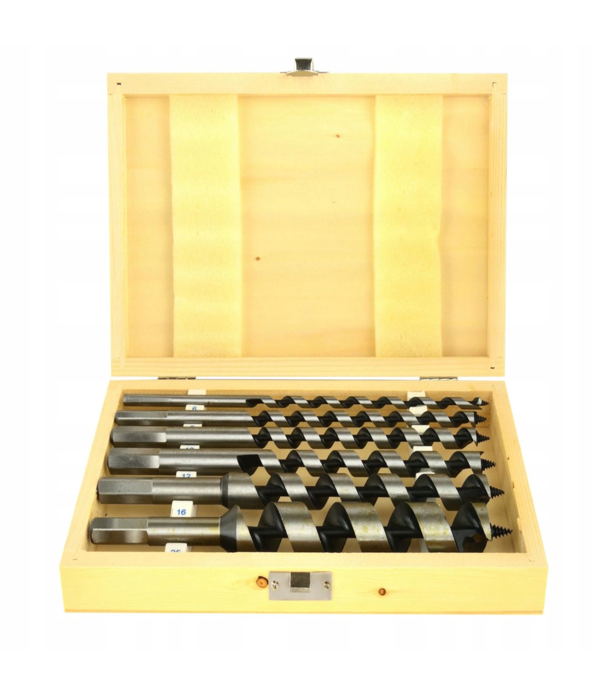 ⭐ Komplet 6 wierteł do drewna o długości 230 mm, idealnych do precyzyjnego wiercenia w różnych gatunkach drewna. Zestaw został zapakowany w estetyczną i poręczną walizkę drewnianą, dzięki czemu wszystkie elementy są zawsze pod ręką i dobrze zabezpieczone.