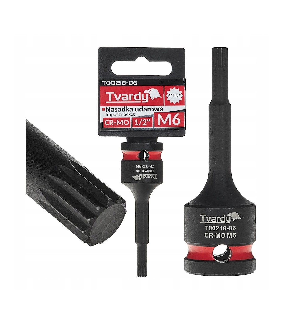 Profesjonalna nasadka udarowa SPLINE M6 marki Tvardy została zaprojektowana specjalnie do pracy z kluczami udarowymi. Dzięki wykonaniu z wytrzymałej stali CR-MO (chromowo-molibdenowej) zapewnia najwyższą odporność na obciążenia i niezawodność w warunkach warsztatowych, przemysłowych oraz podczas montażu konstrukcji.