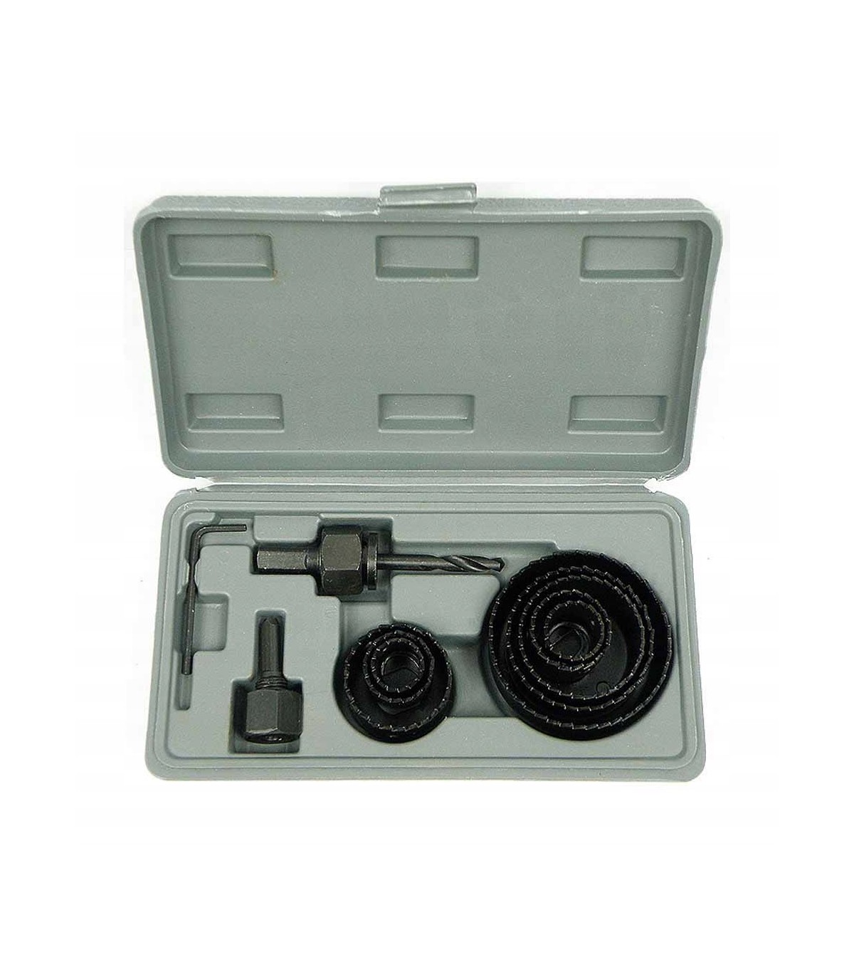 W zestawie znajdują się otwornice w rozmiarach: 19, 22, 29, 32, 38, 44, 51, 64 mm.