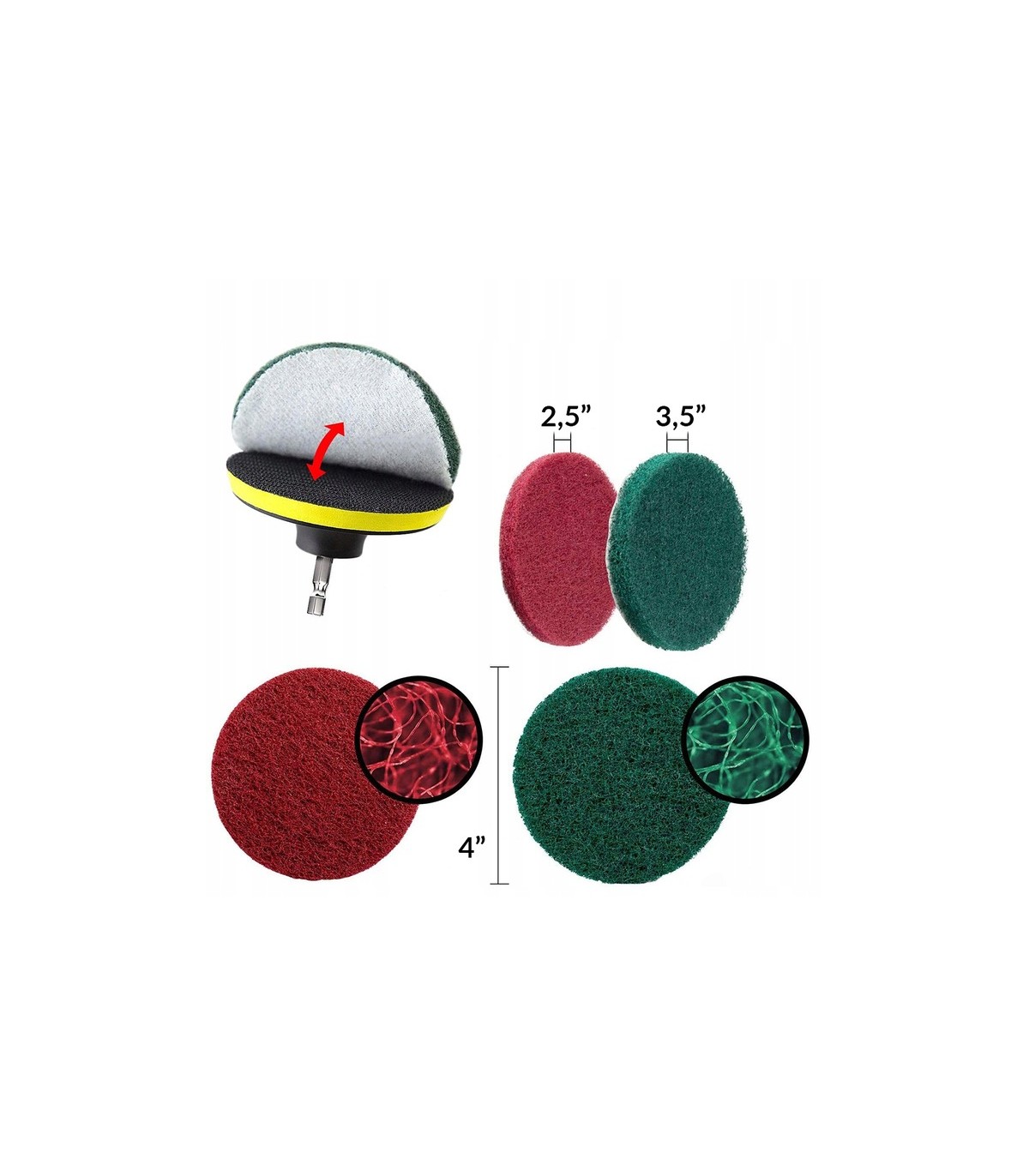 - ✨ Nakładki czerwone, szare, zielone i pomarańczowe: Wielokolorowe nakładki średnicy 100mm umożliwiające dopasowanie do różnych typów powierzchni i stopnia zabrudzenia.