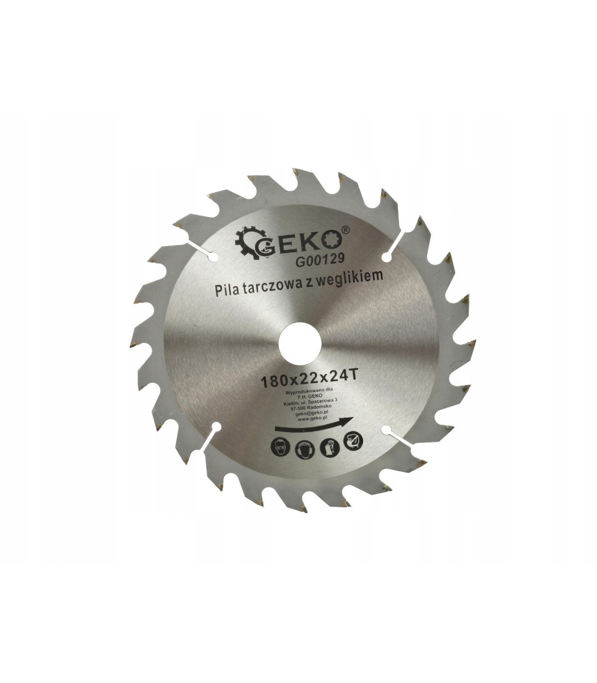 Tarcza tnąca do drewna z widią marki Geko, o wymiarach 180x22 mm z 24 zębami tnącymi.