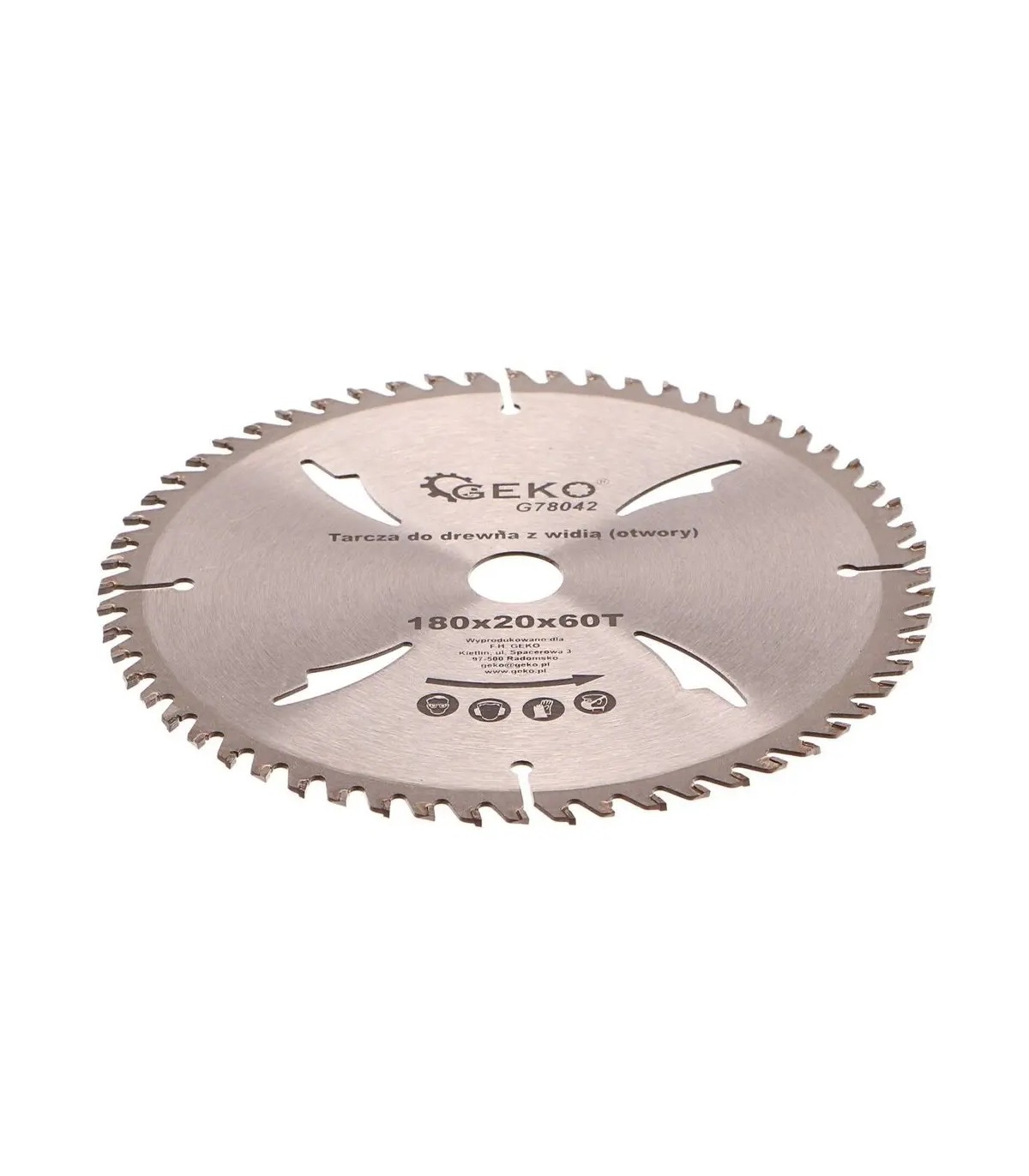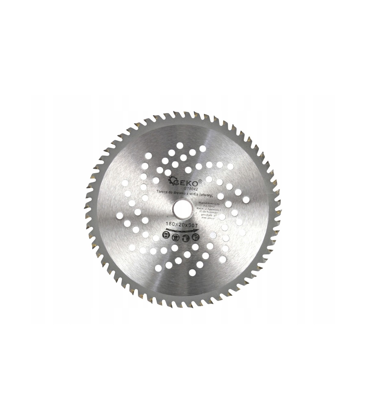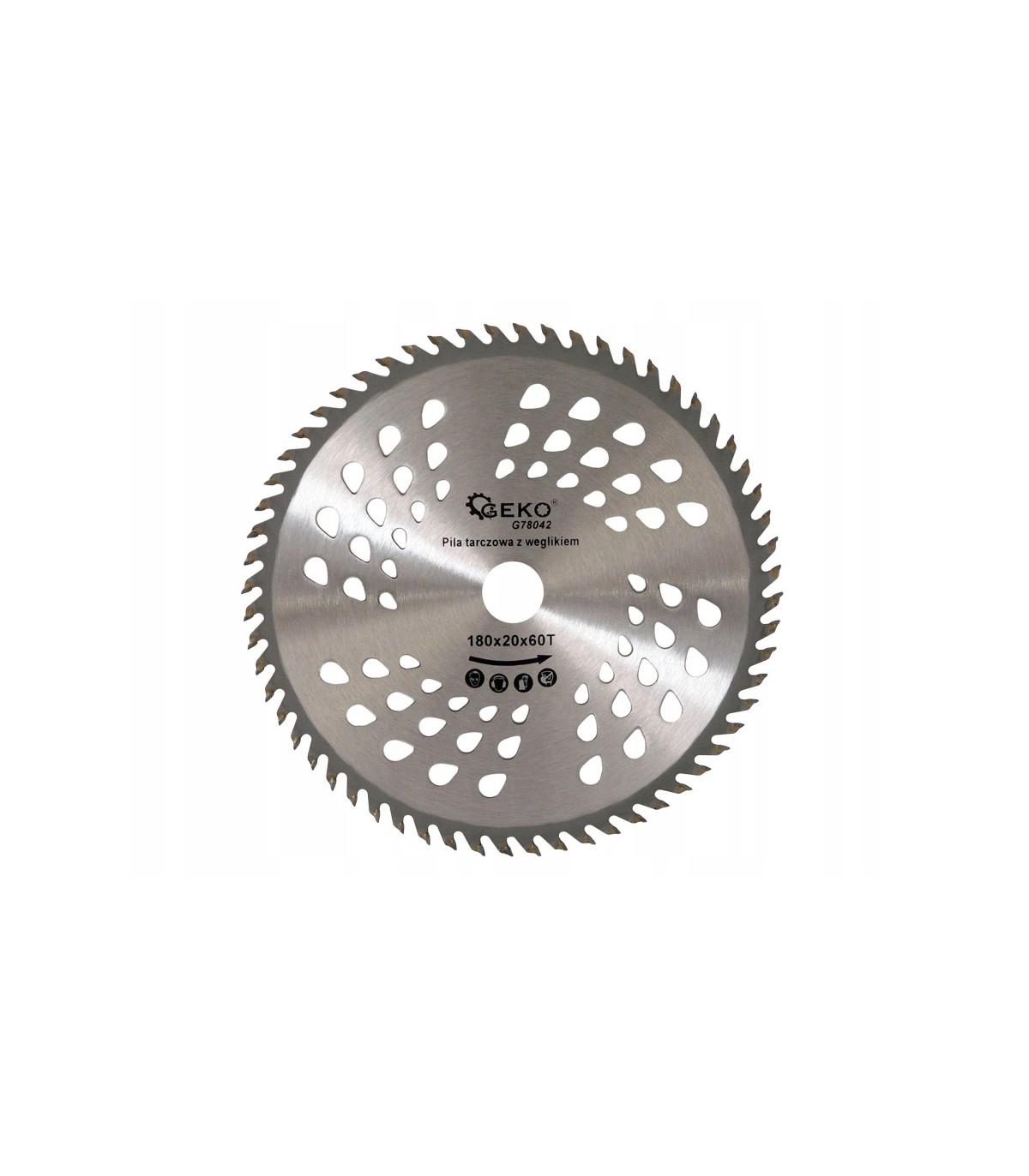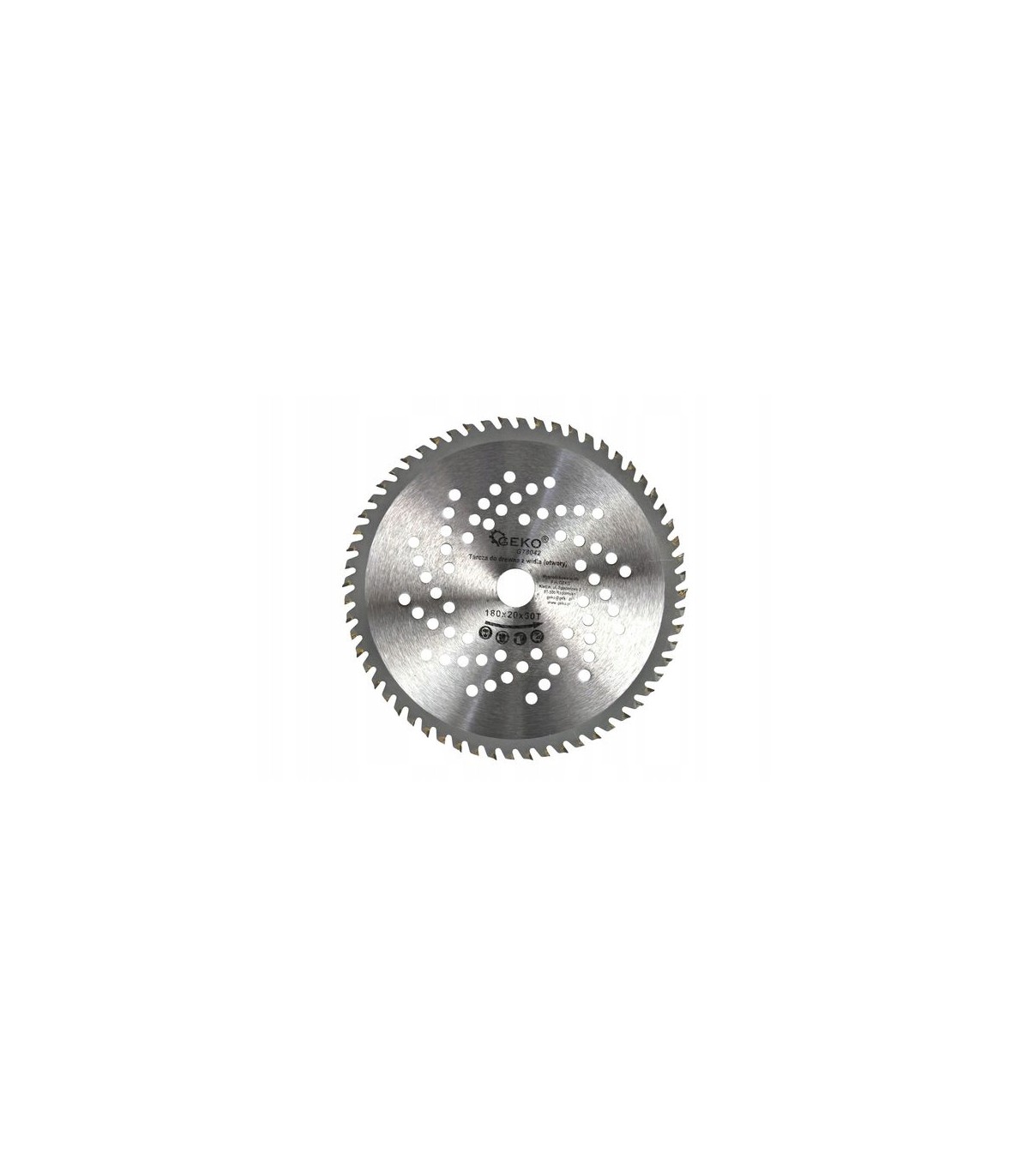 Tarcza tnąca do drewna z widią marki Geko, o wymiarach 180x20 mm z 60 zębami tnącymi.