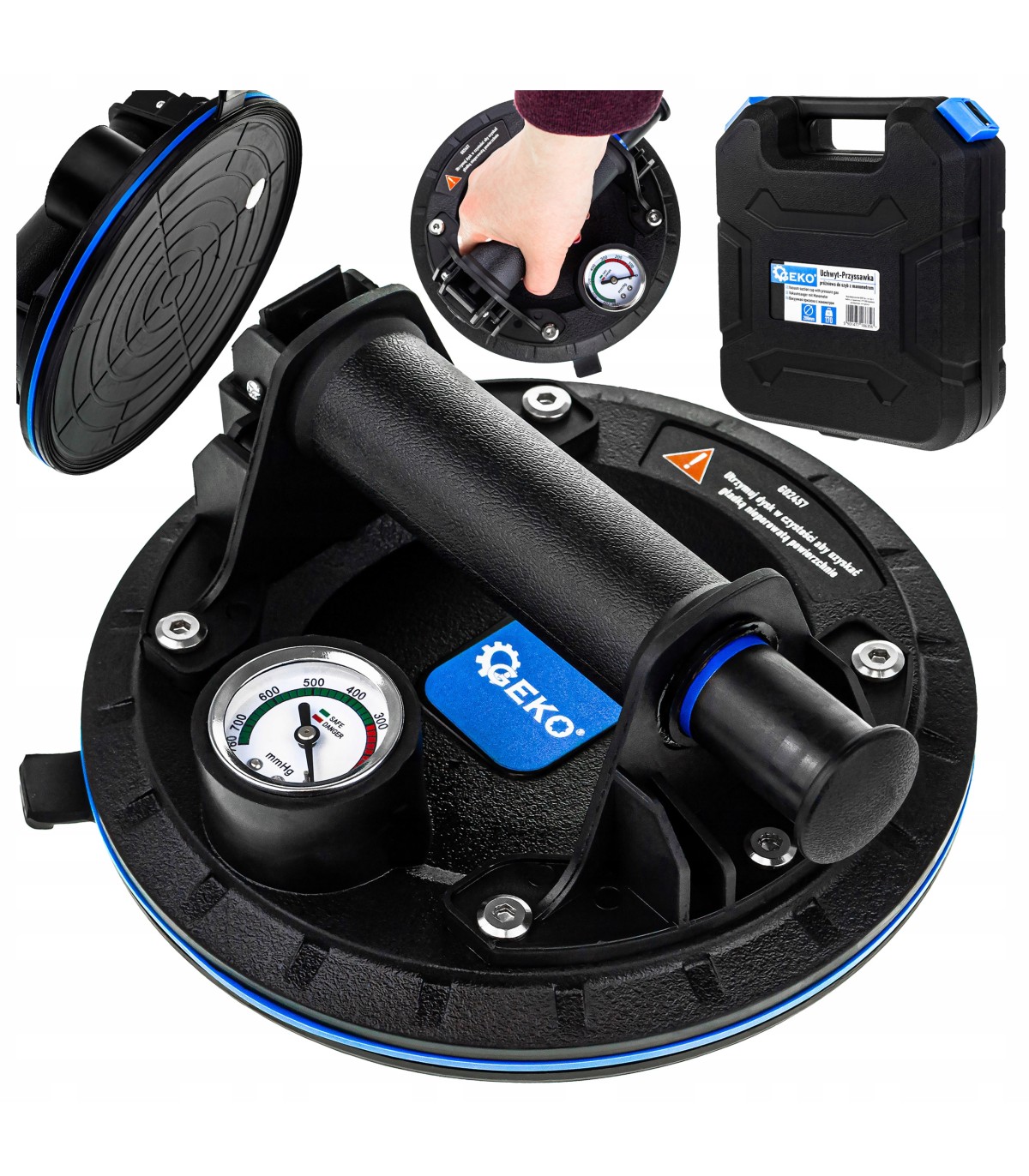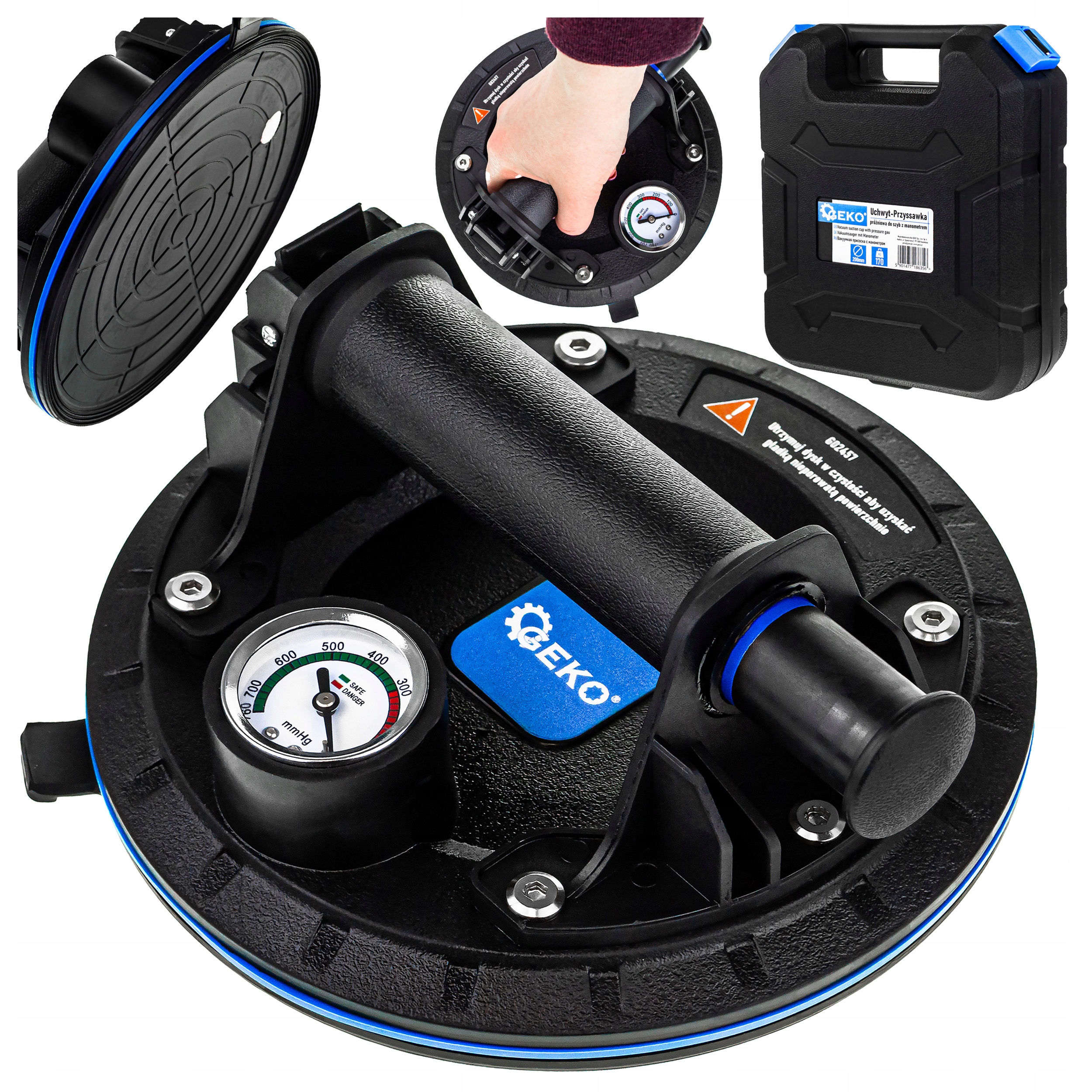 Profesjonalny uchwyt – przyssawka próżniowa do szyb, przeznaczony do montażu oraz unoszenia elementów o gładkiej powierzchni, takich jak szyby, szkło, płytki czy inne panele. Wyposażony w pompkę próżniową oraz manometr, zapewnia maksymalną kontrolę, bezpieczeństwo i komfort pracy.