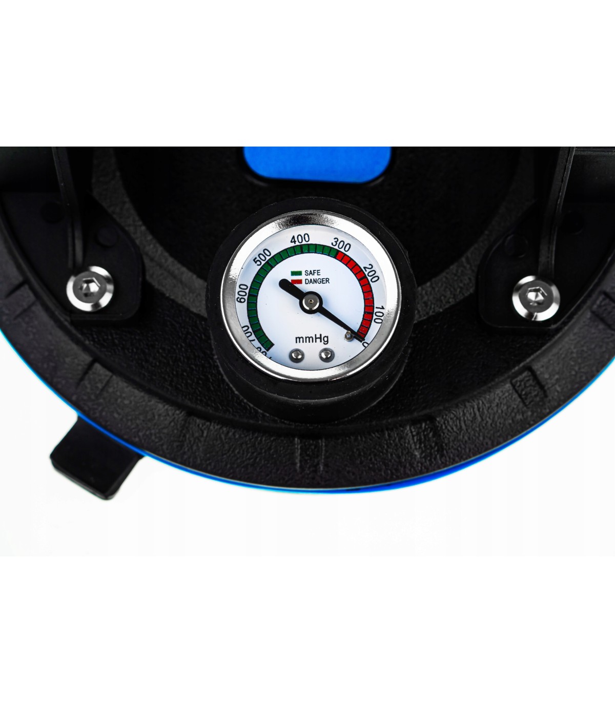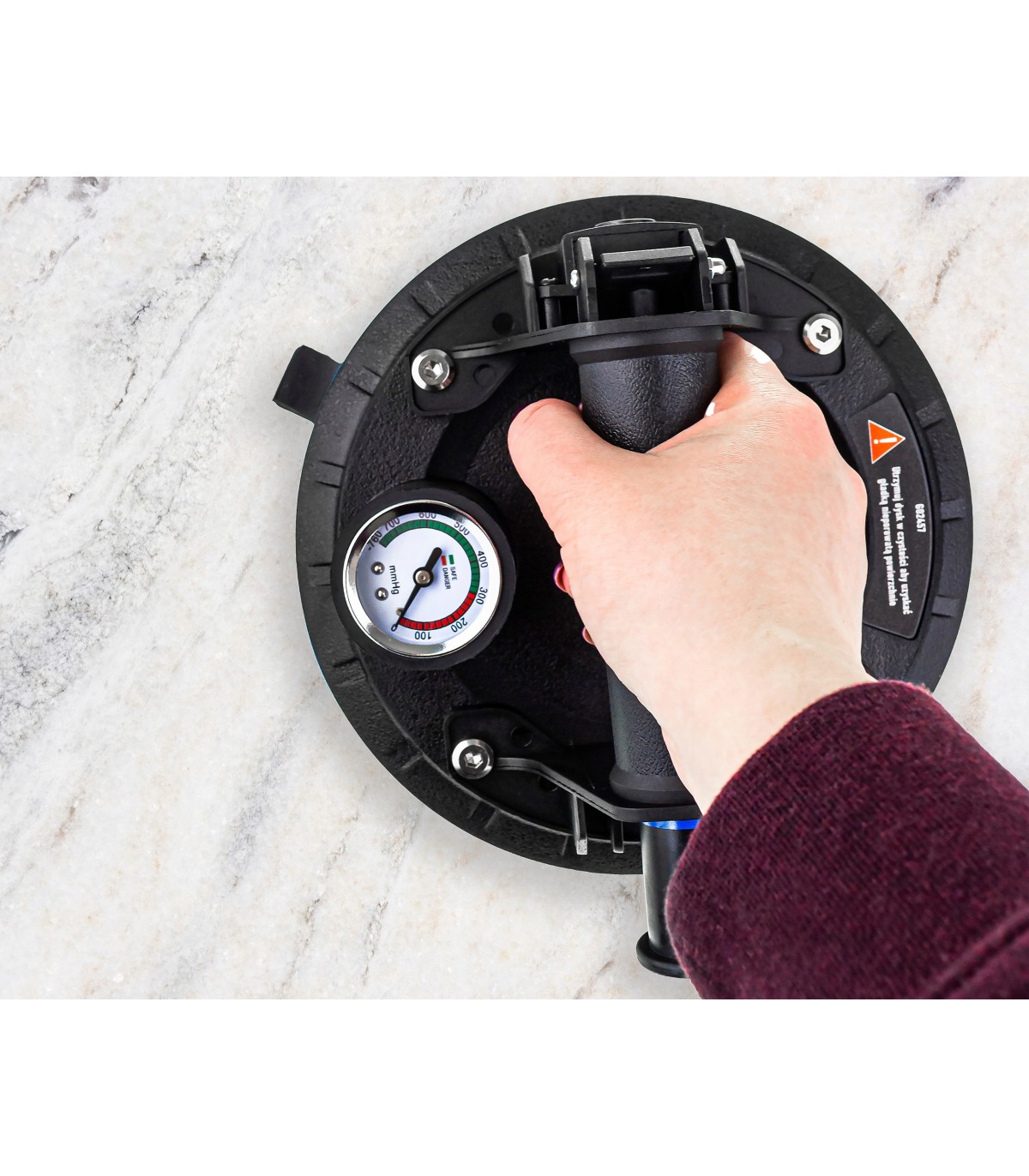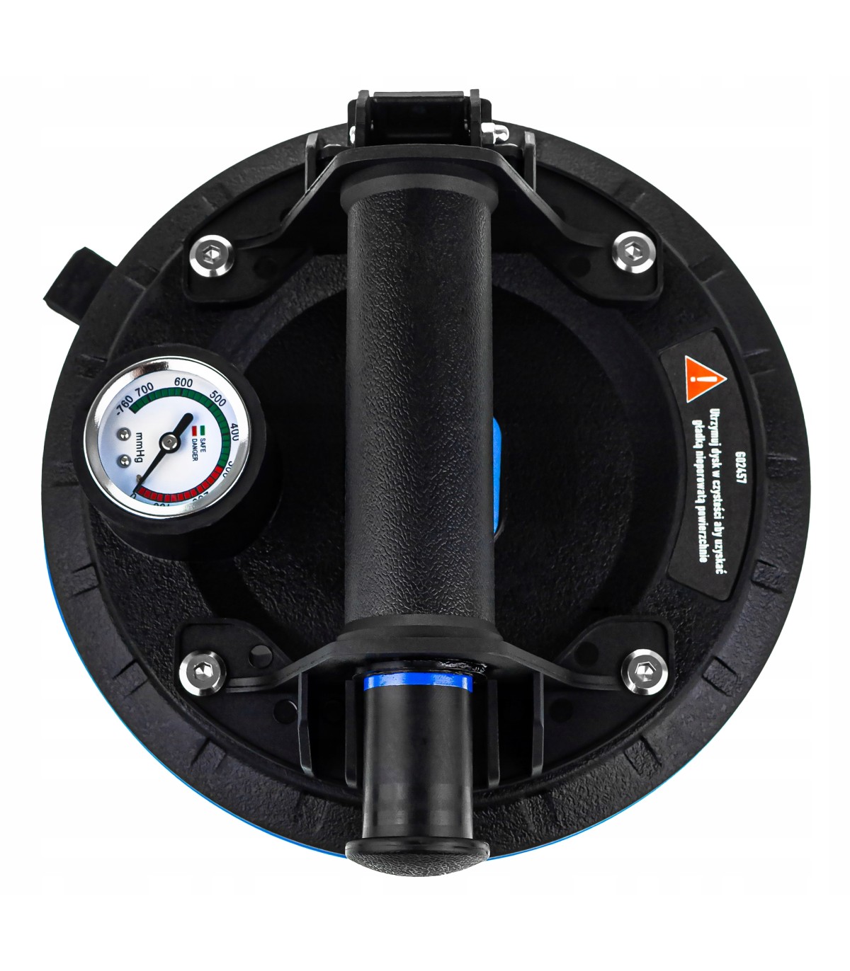 Zastosowany system tłokowy umożliwia bieżące dopompowywanie próżni bez konieczności odrywania uchwytu od przenoszonego elementu, co znacząco zwiększa bezpieczeństwo w porównaniu do standardowych przyssawek. Manometr pozwala na stałe monitorowanie poziomu podciśnienia.