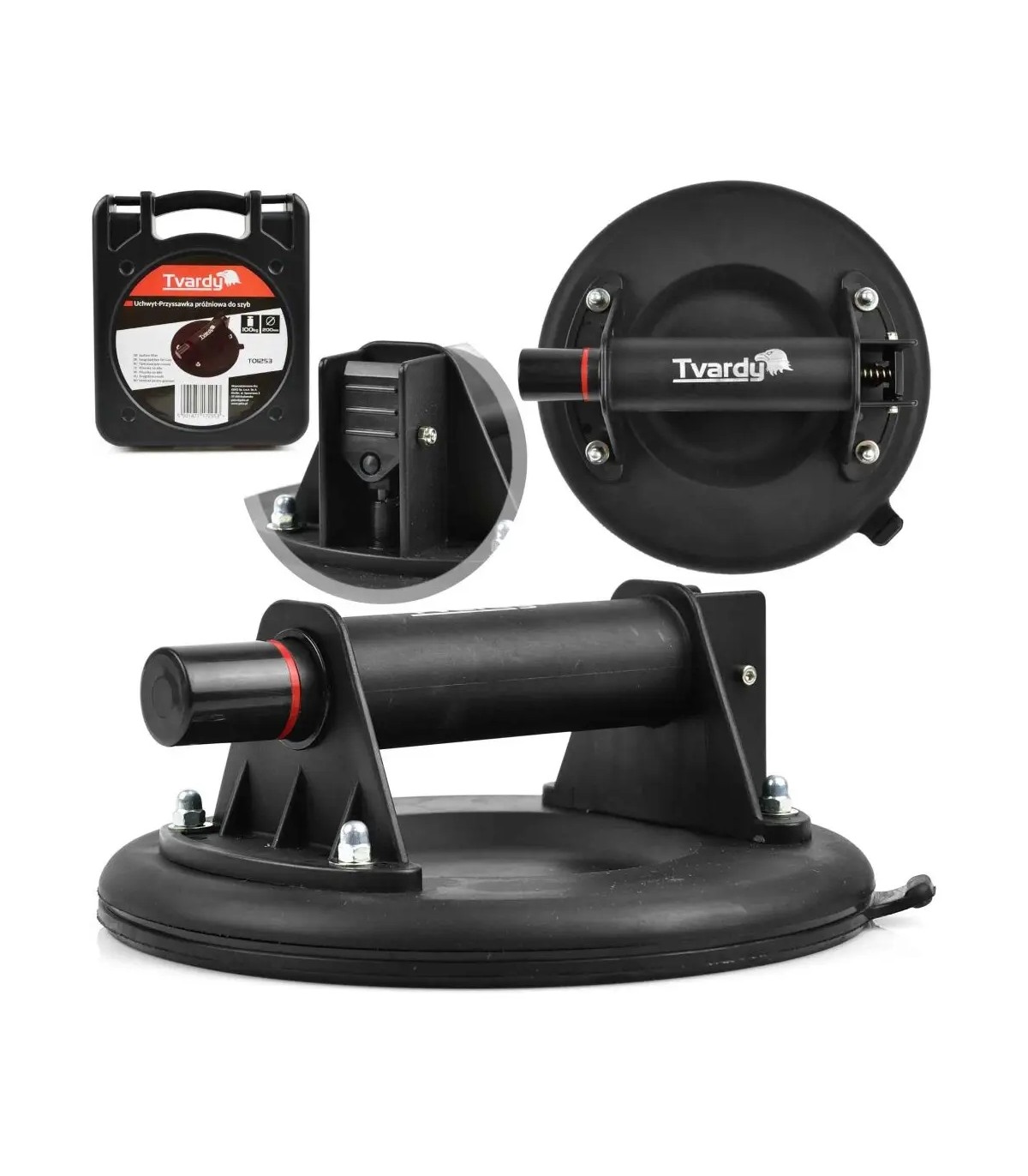 Najwyższej jakości uchwyt marki TVARDY przeznaczony do bezpiecznego przenoszenia i montażu różnych elementów np. szyb, glazury, spieków kwarcowych, gresu, blach, płyt laminowanych i wielu innych.