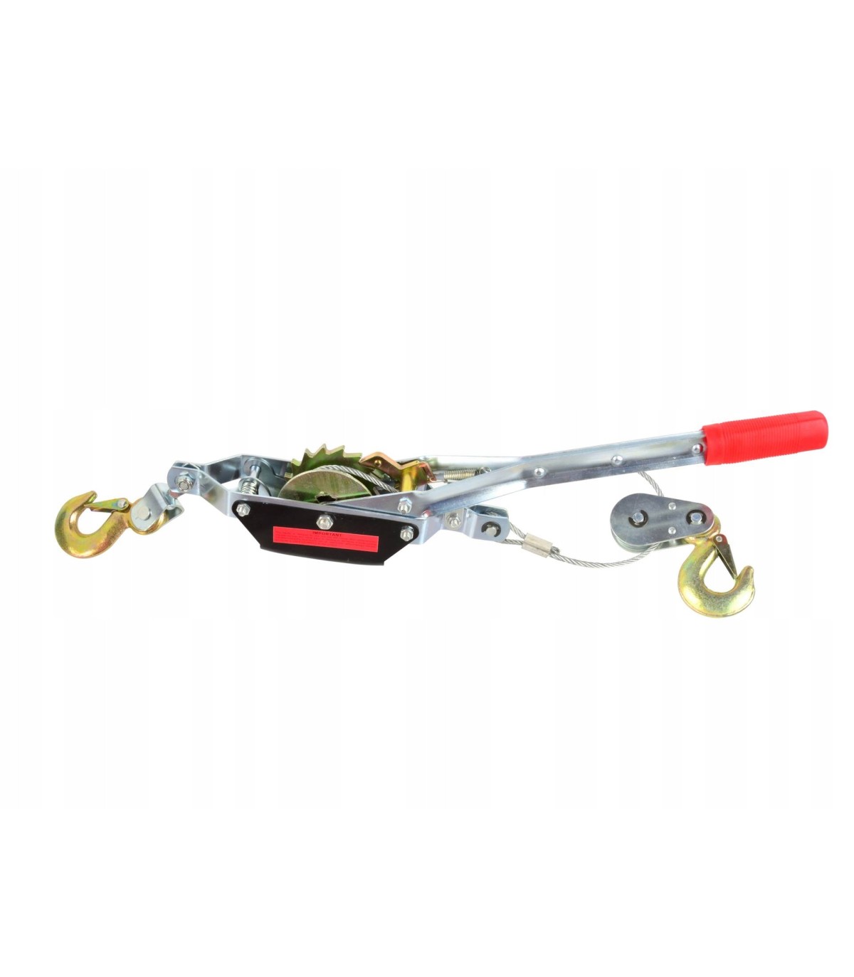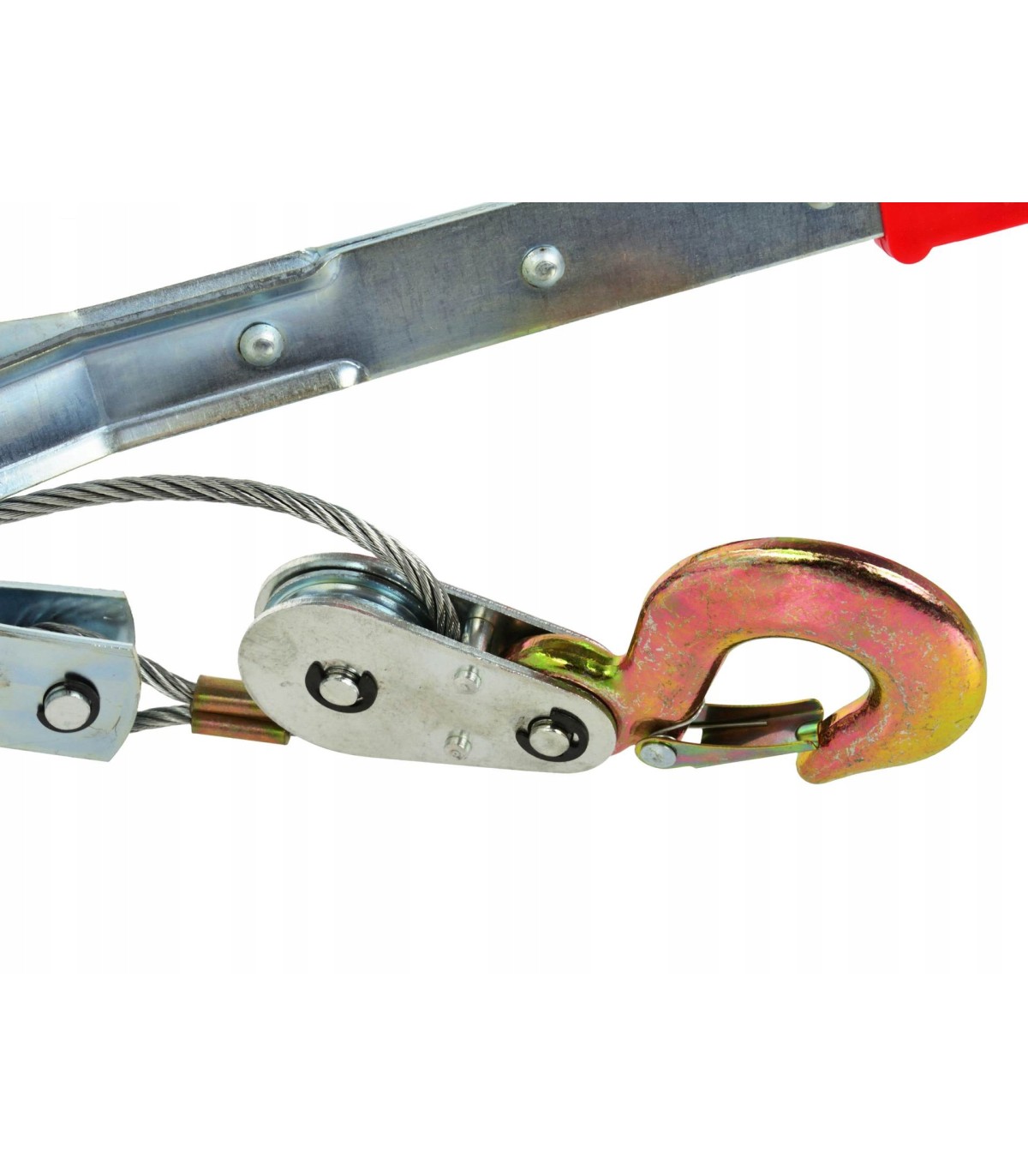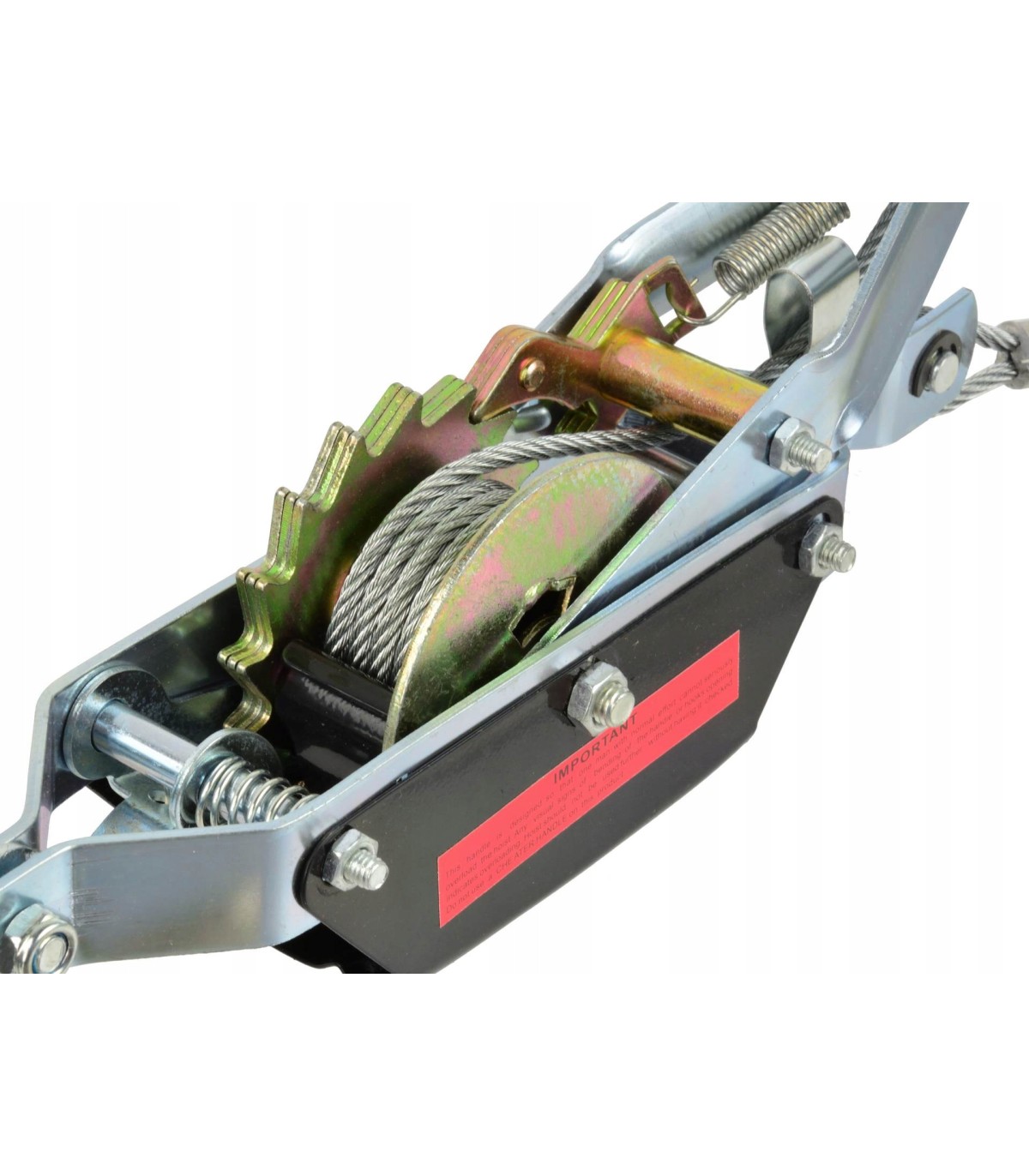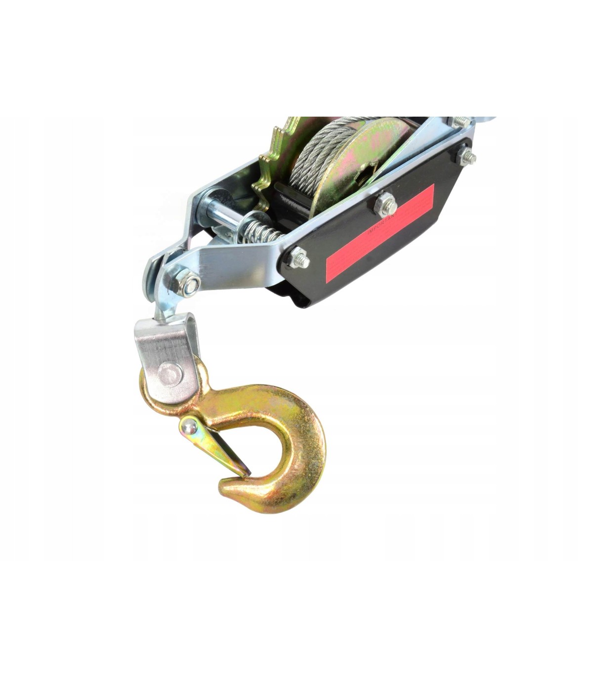 Ręczna wciągarka linowa pozioma. Wciągarka wyposażona została w 1-trybowy mechanizm blokujący, stalową linę o średnicy 4,5 mm i długości 2,5 m, co w połączeniu z wytrzymałymi hakami generuje siłę uciągu na poziomie 2000 kg.