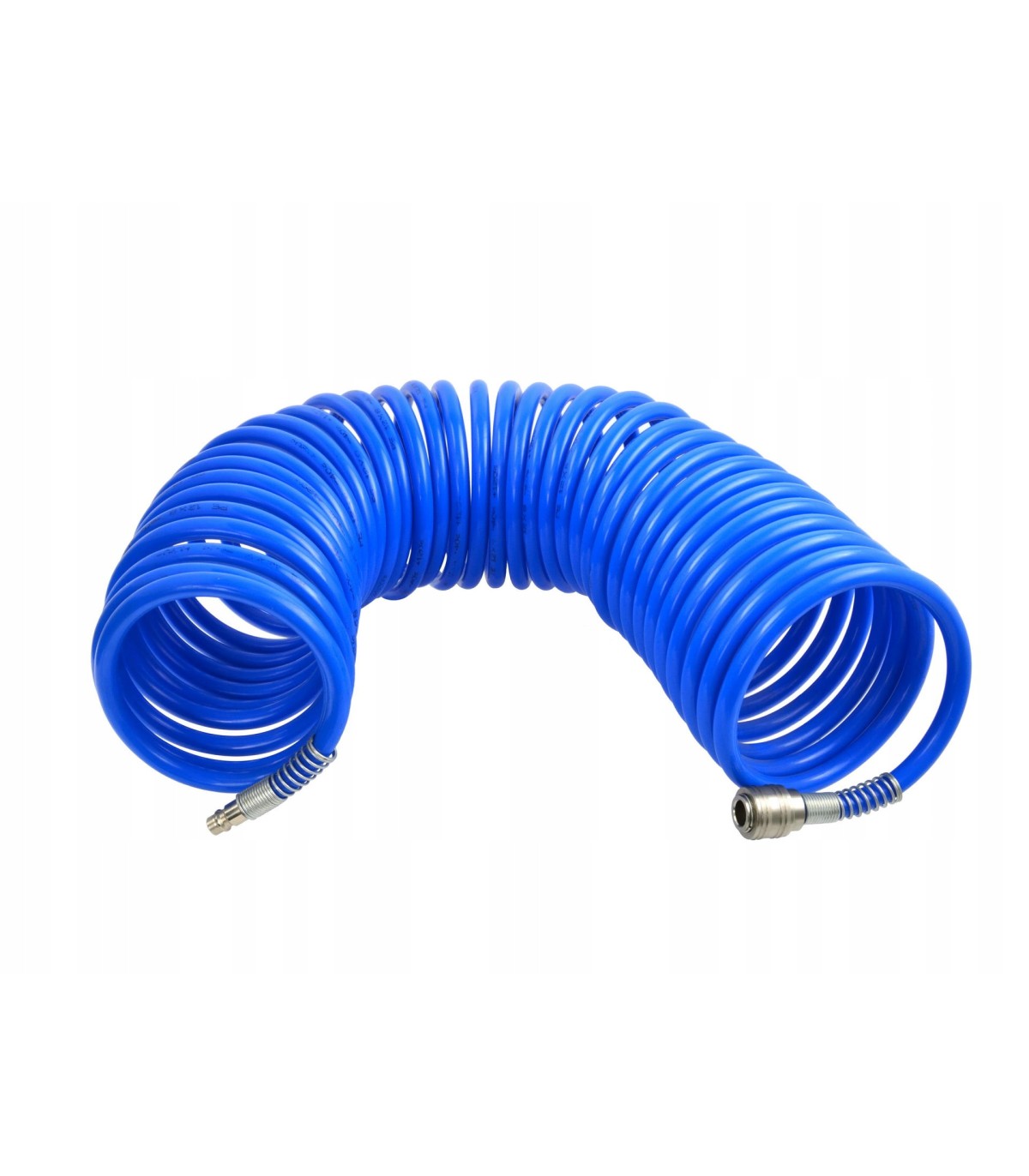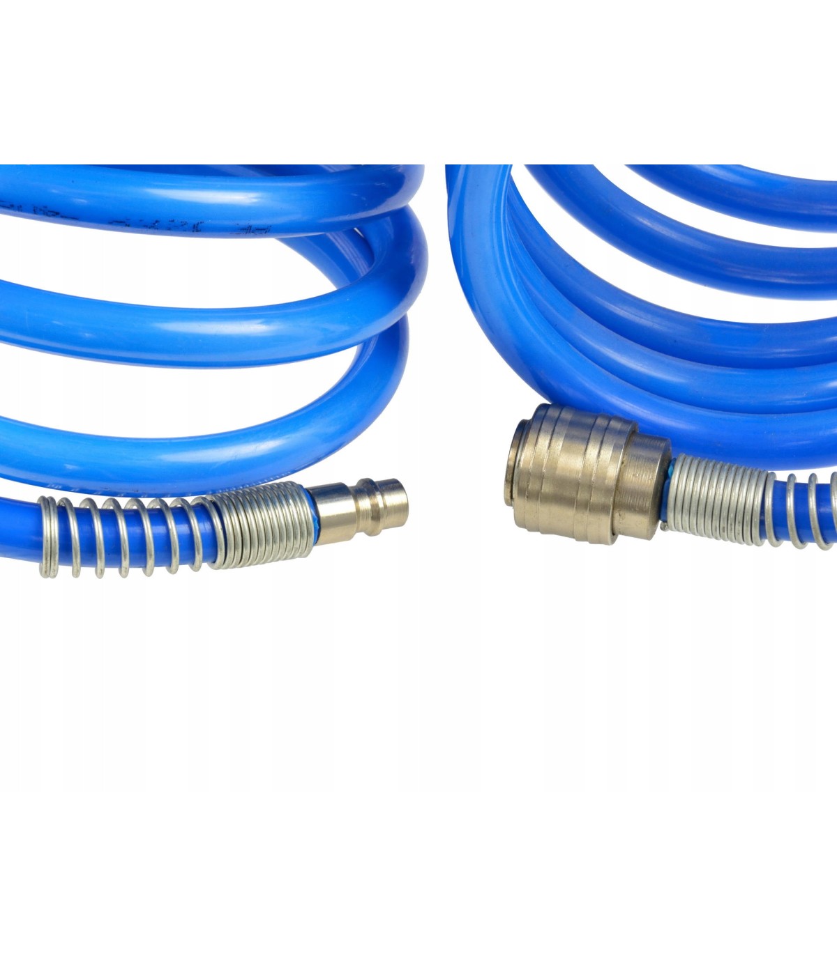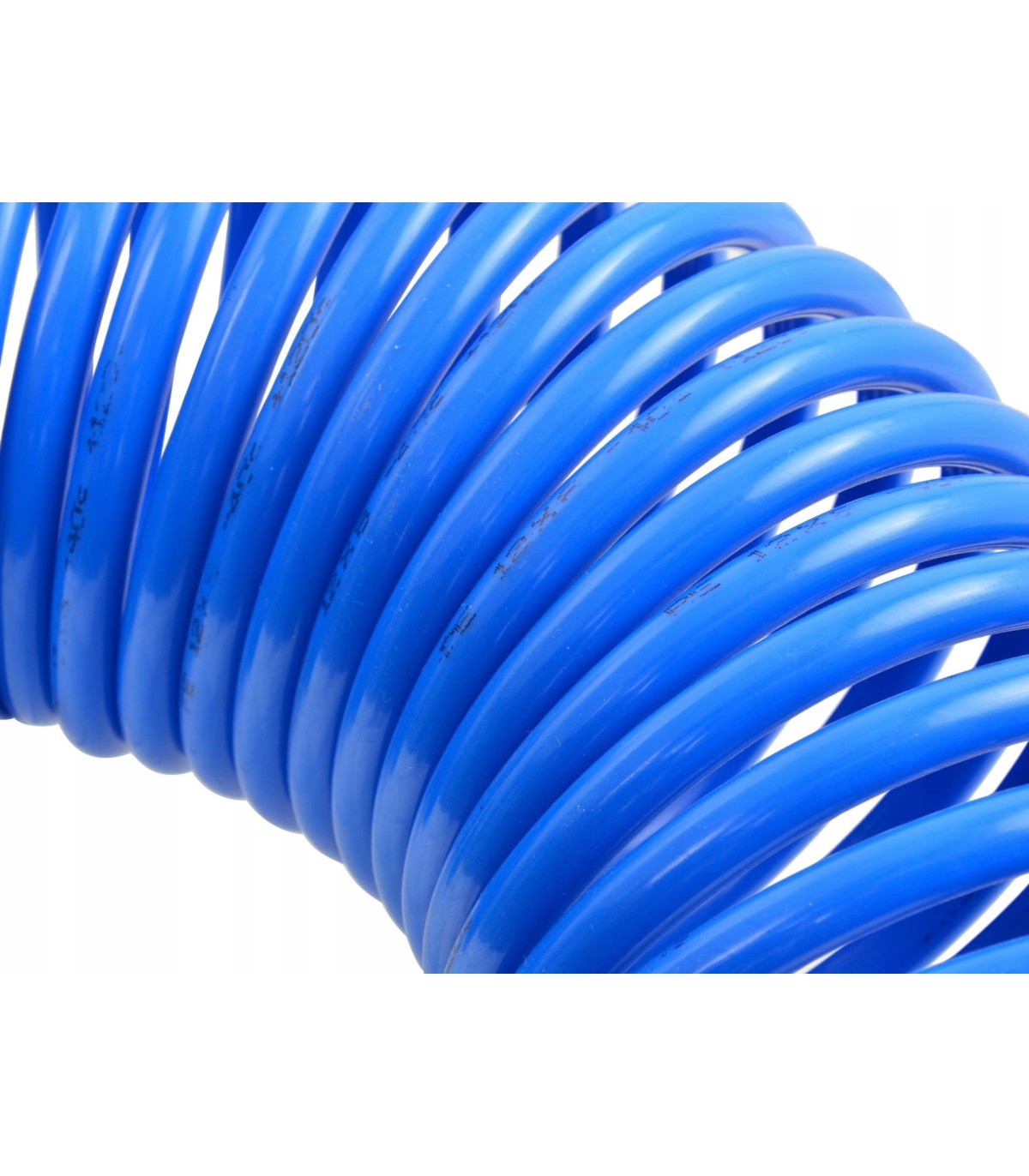 ✅Wąż pneumatyczny spiralny z polietylenu z obrotowymi końcówkami oraz sprężynami zabezpieczającymi na końcach.