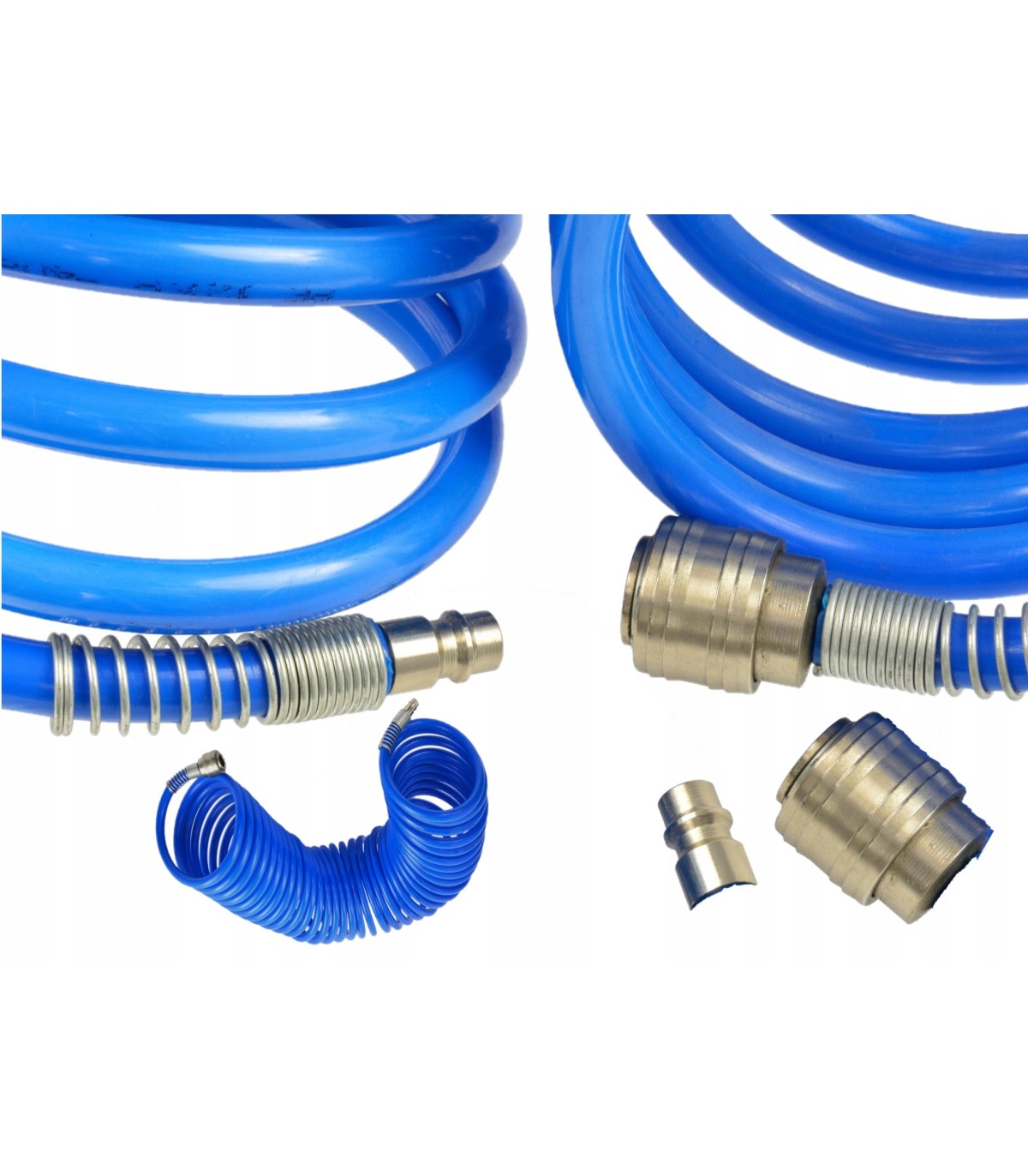 ⭐ Wąż pneumatyczny spiralny z polietylenu z obrotowymi końcówkami oraz sprężynami zabezpieczającymi na końcach.