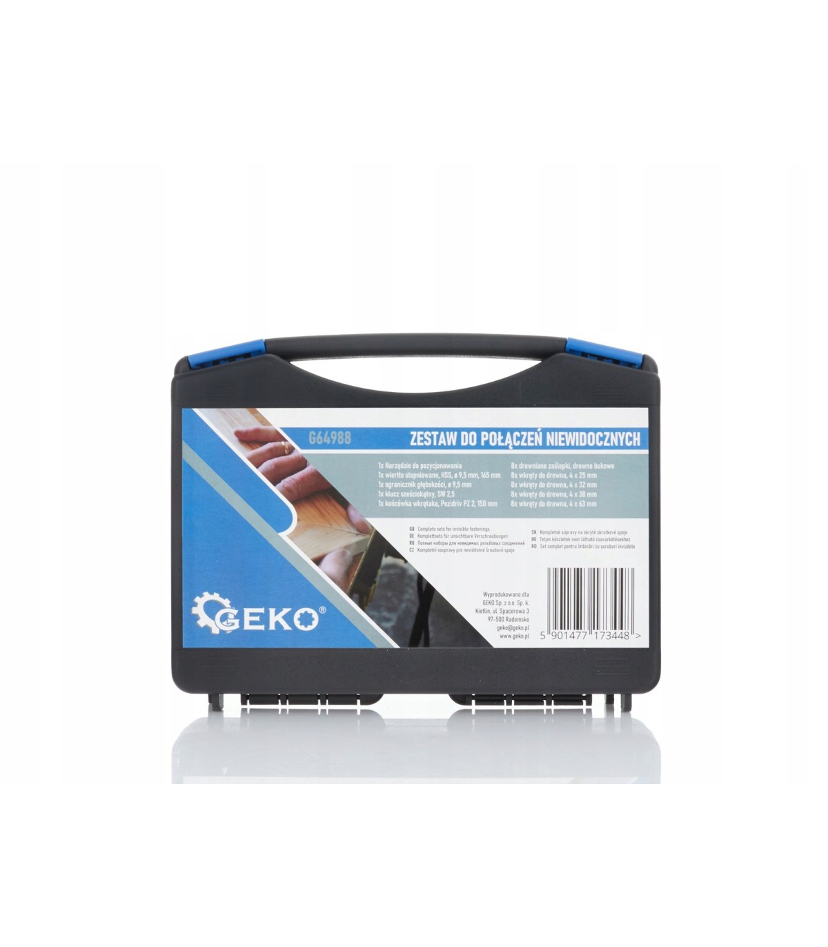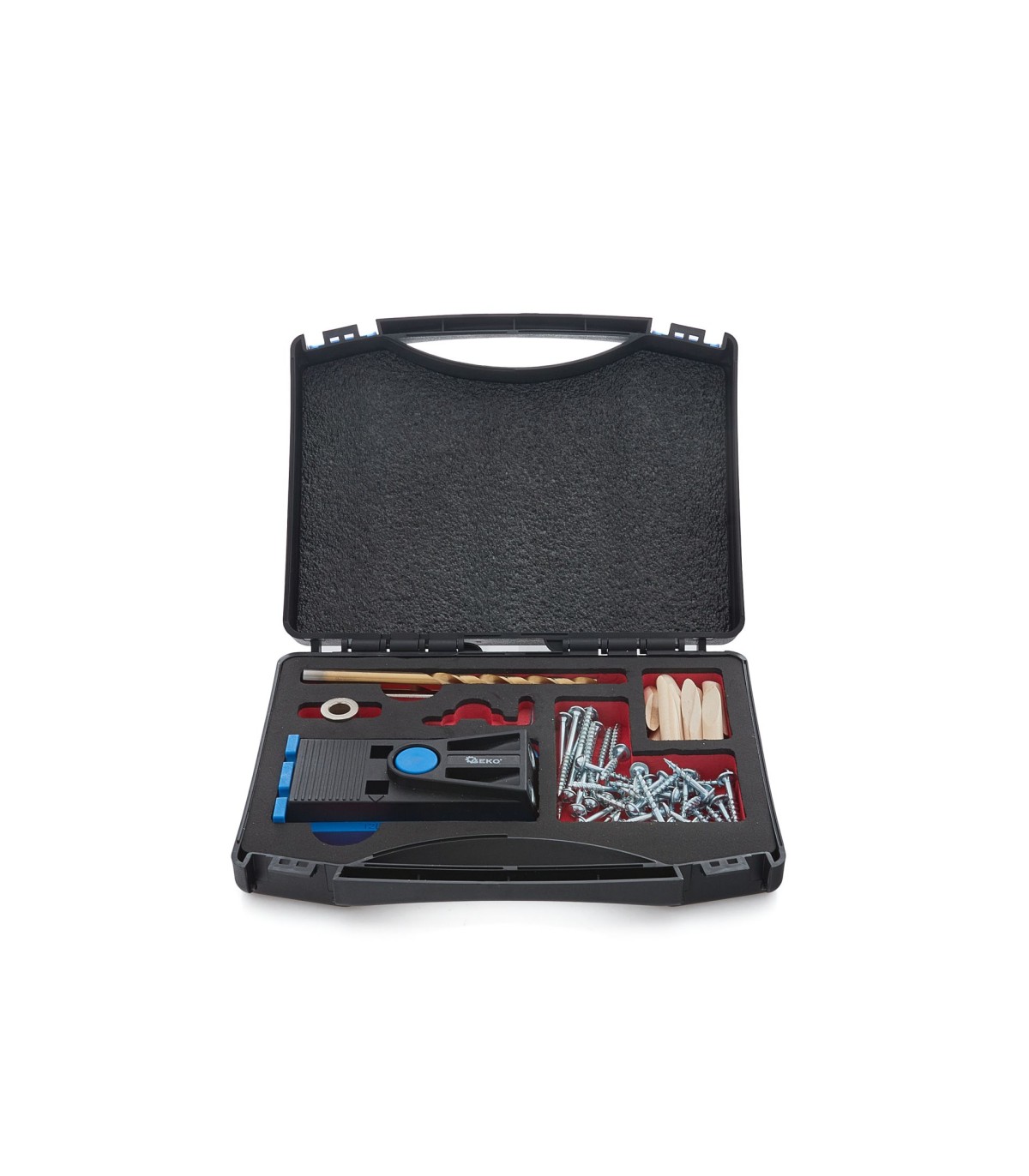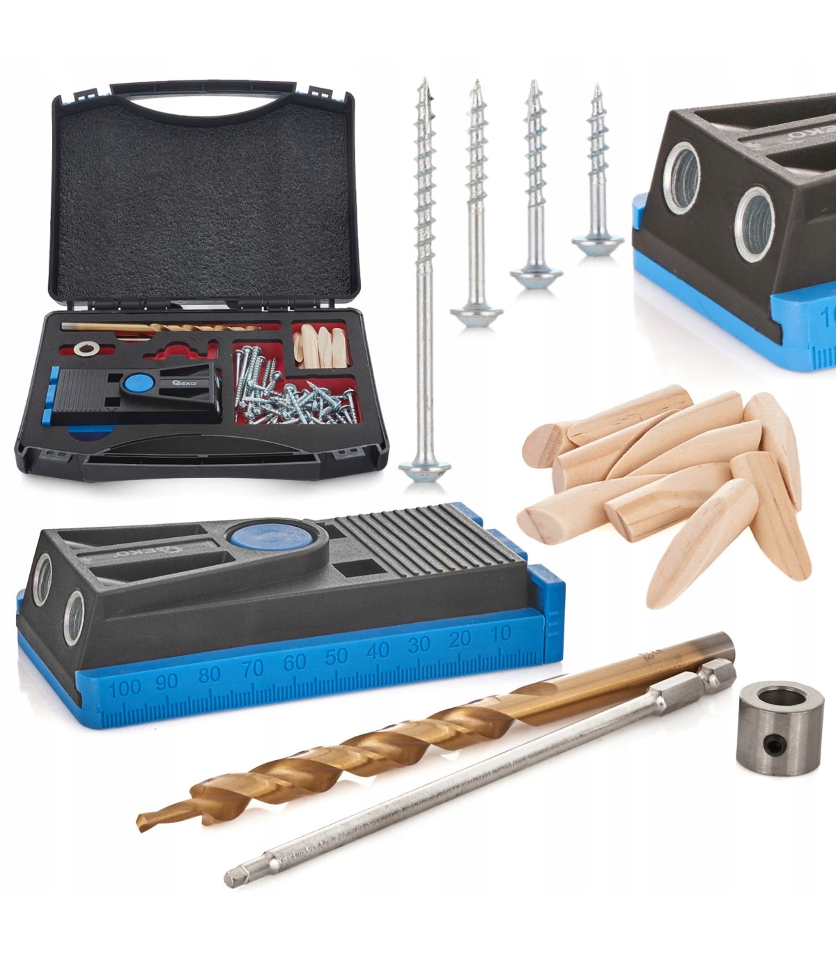 Kompletny zestaw do wykonywania połączeń niewidocznych przy użyciu wkrętów do drewna. Dzięki zestawowi marki Geko w 3 krokach wykonasz precyzyjne i stabilne połączenie ukryte. Głównym elementem zestawu jest szablon przeznaczony do wykonywania precyzyjnych otwórów pod odpowiednim kątem. Następnym krokiem po wykonaniu otworów jest połączenie ze sobą dwóch drewnianych elementów przy pomocy dołączonych do zestawu wkrętów o różnej długości. Ostatnim etapem pracy jest zamaskowanie otworów specjalnymi kołkami skośnymi, a następnie docięcie kołów i wyszlifowanie powierzchni.