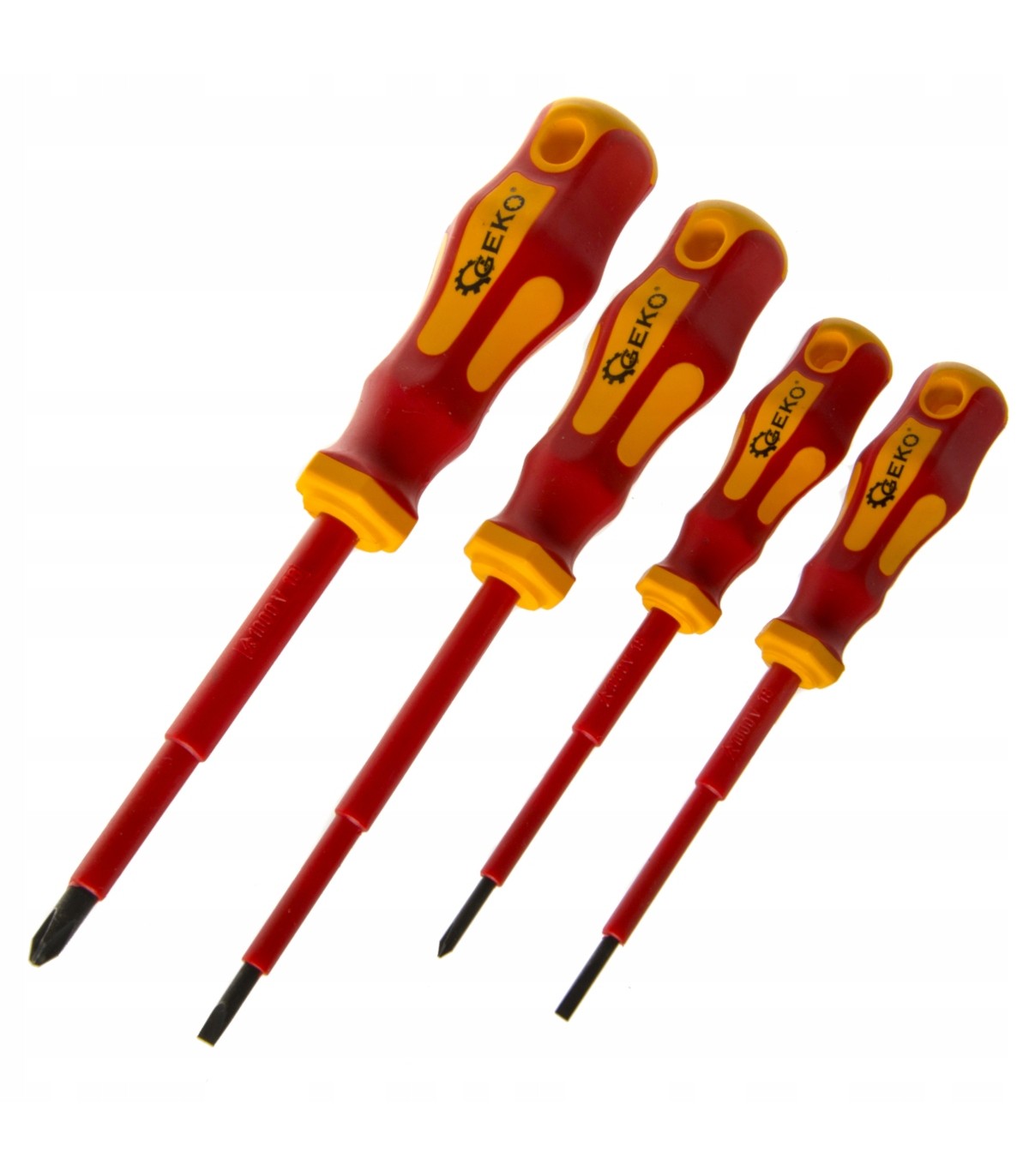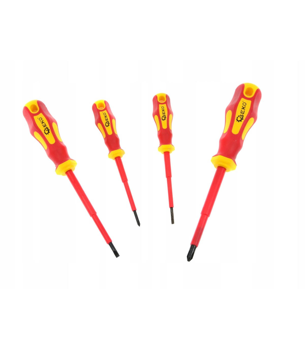 Zestaw wysokiej jakości wkrętaków elektrycznych izolowanych 1000V renomowanej marki GEKO. Wykonane z wysokiej jakości stali CRV. Pewny i wygodny chwyt zapewnia ergonomiczna, dwu-kompozytowa rękojeść z antypoślizgowego tworzywa sztucznego. Wkrętaki posiadają certyfikat VDE oraz GS.