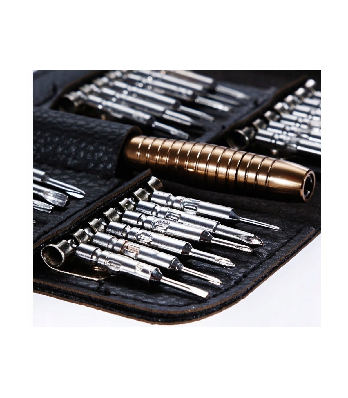 Całość zapakowana w eleganckie i poręczne etui z ekoskóry, które bez problemu zmieści się w kieszeni lub torbie narzędziowej.