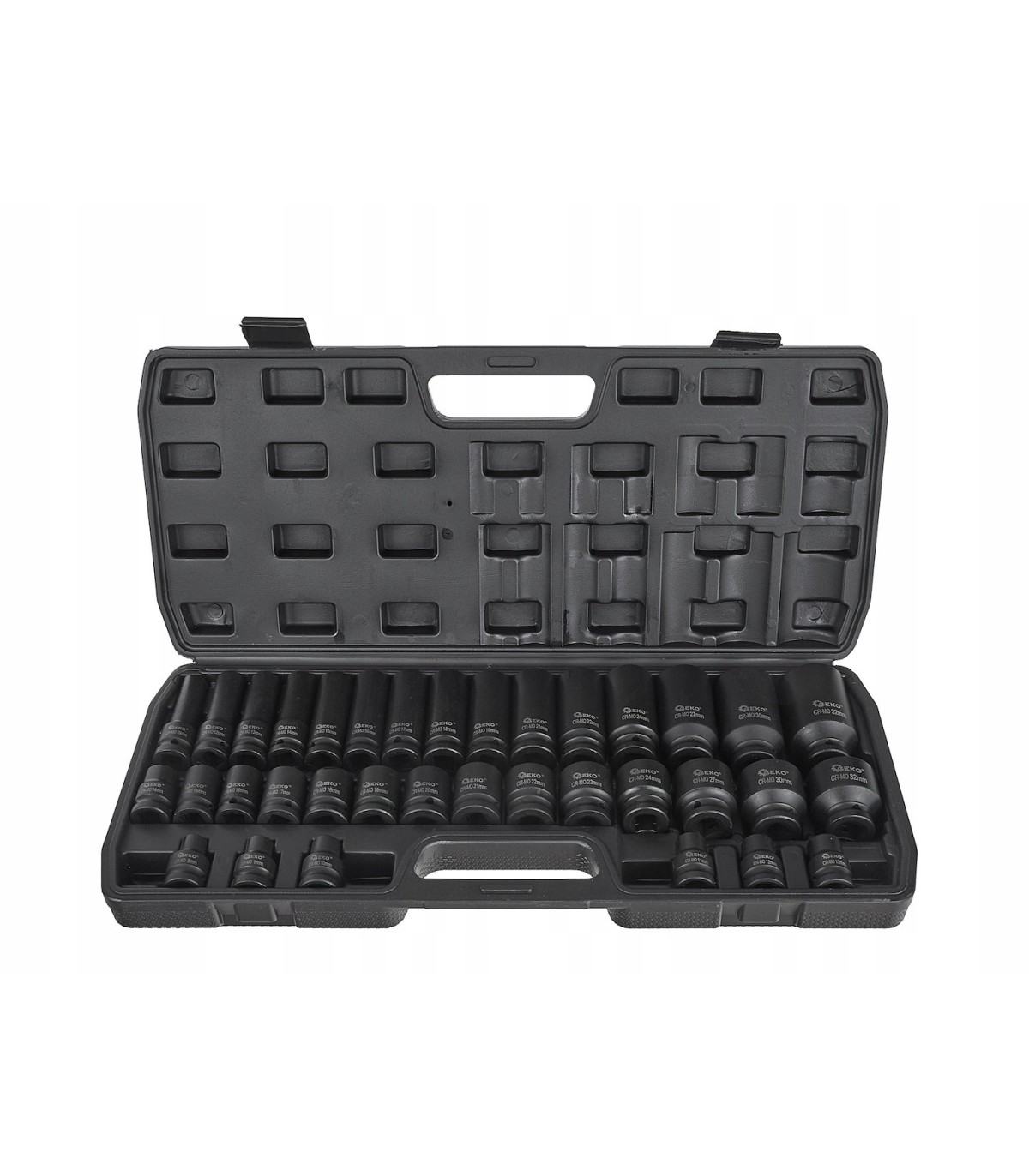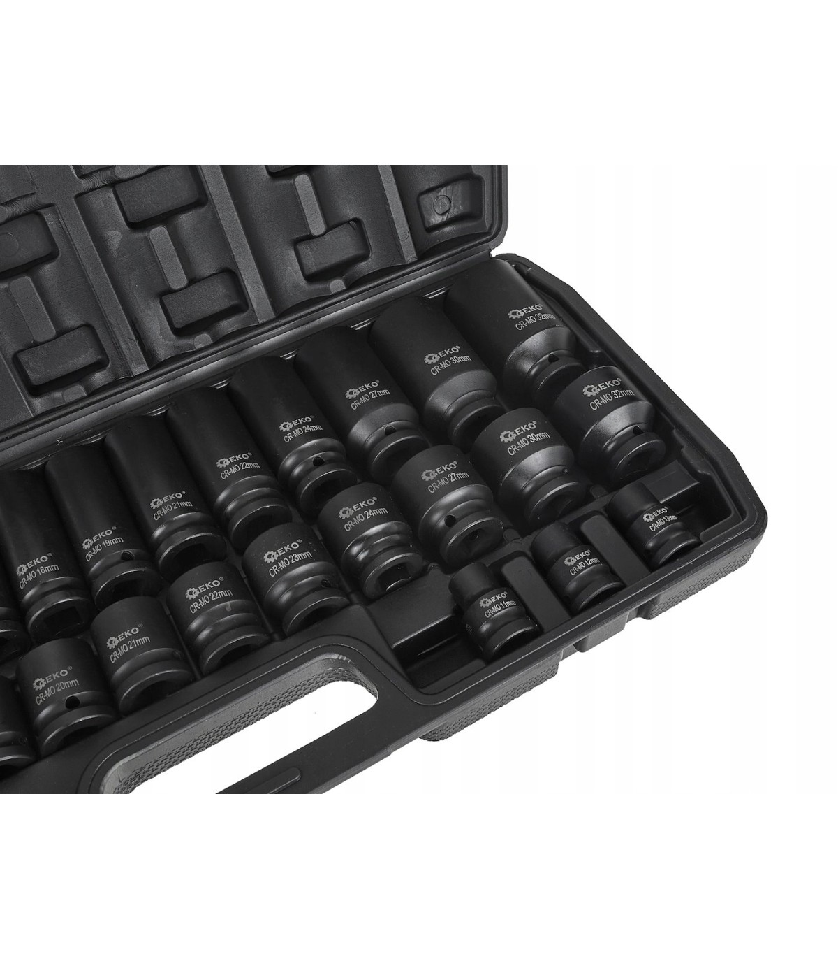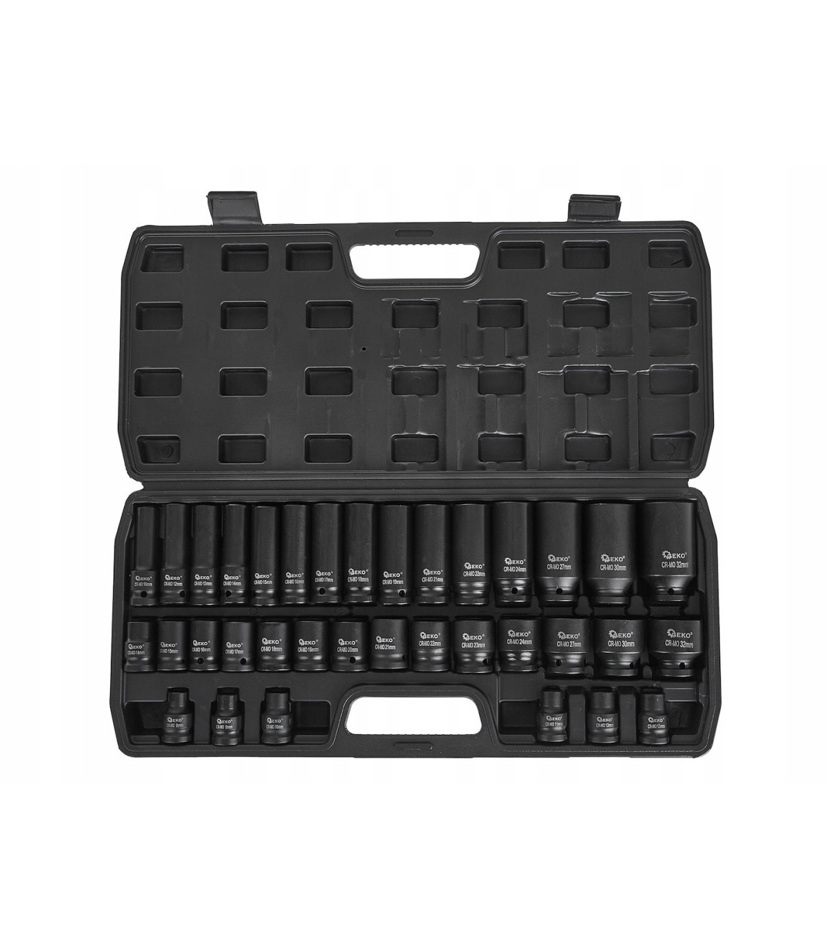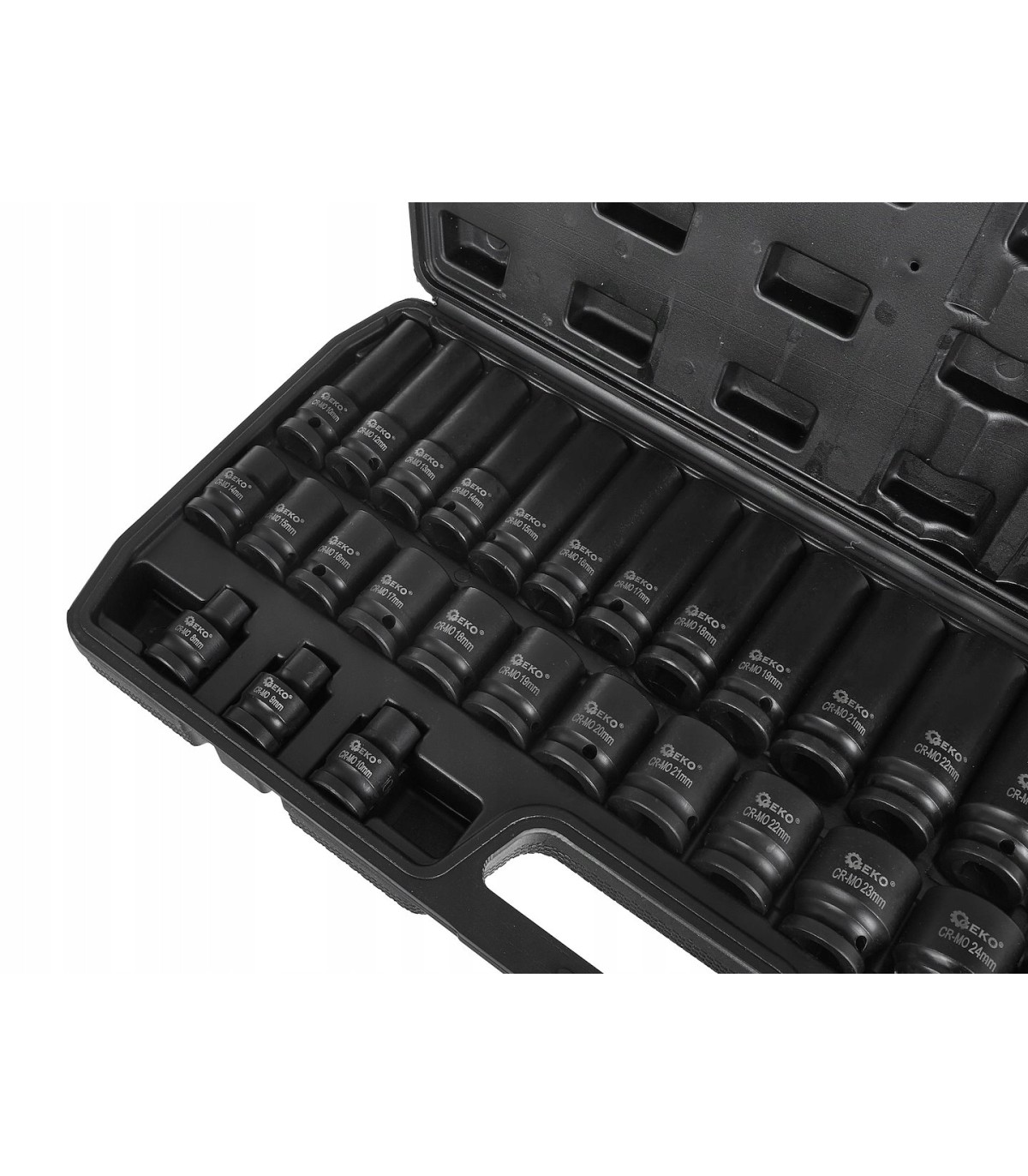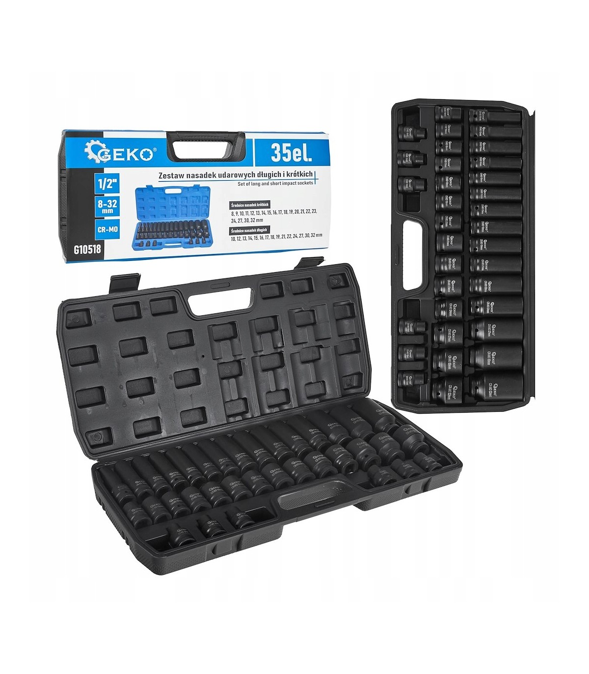 ✅ Kompletny zestaw 35 elementów – nasadki udarowe długie i krótkie w rozmiarach od 8 do 32 mm