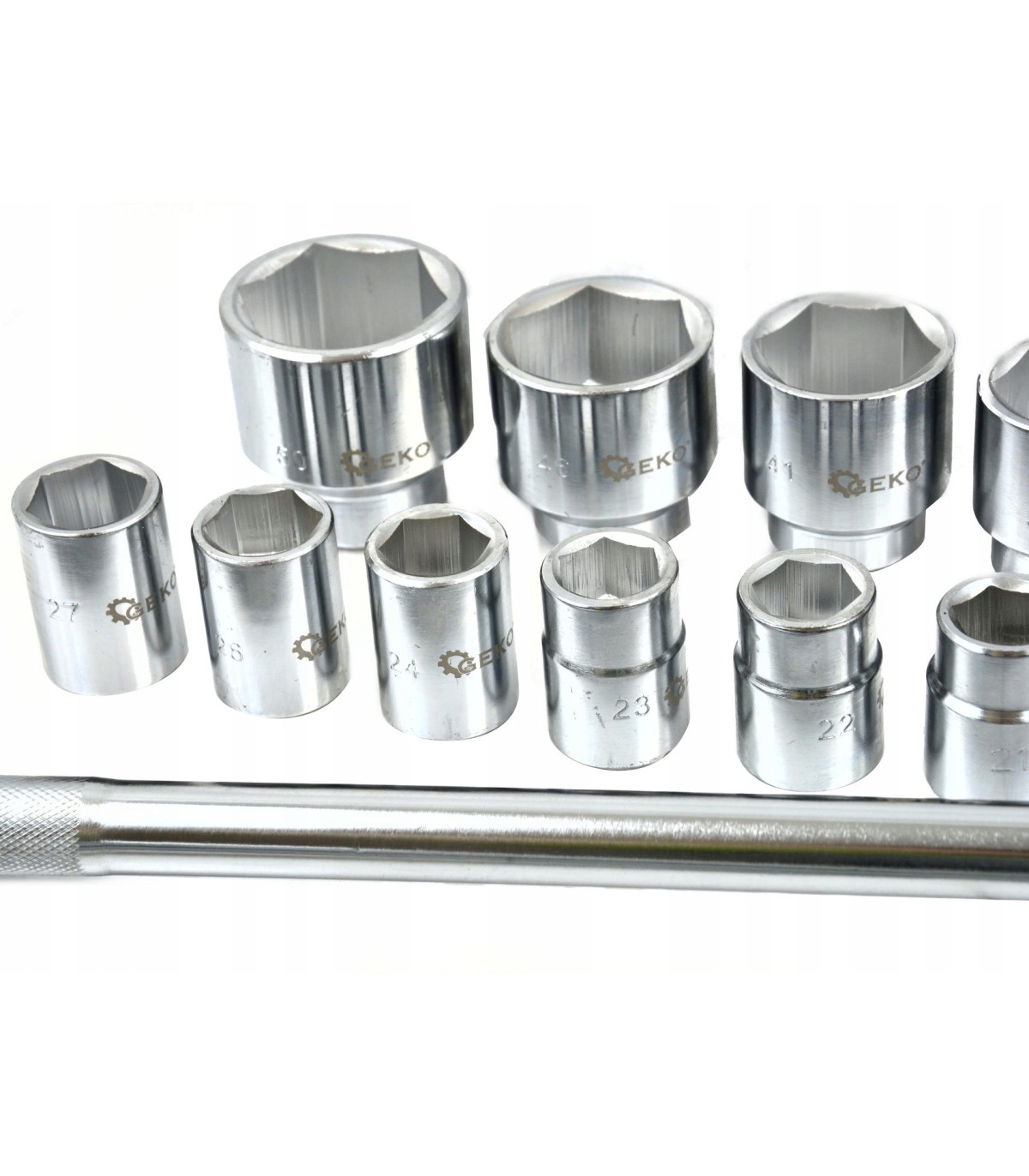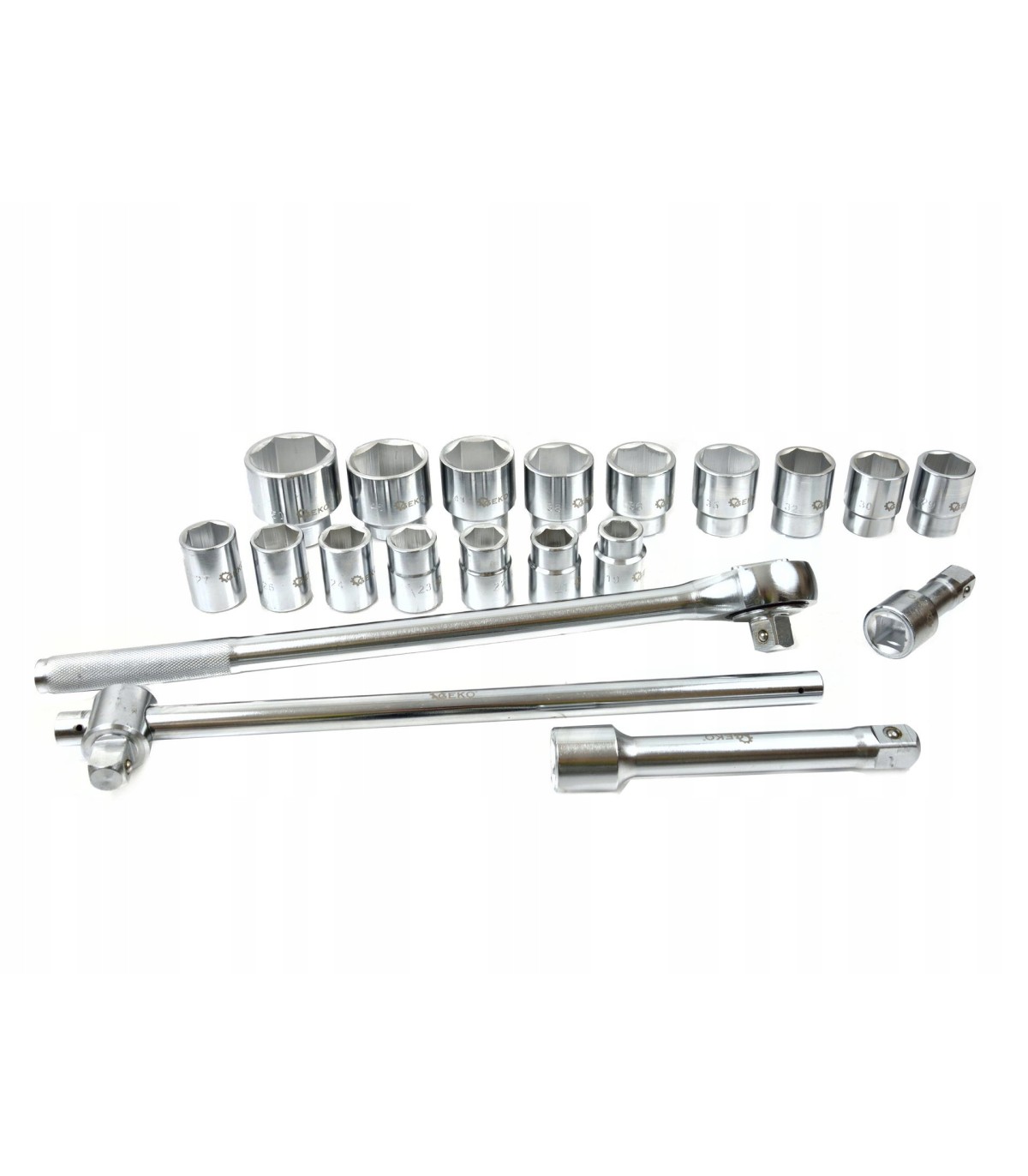 ✅ Zestaw kluczy nasadowych składający się z 21 elementów. Zestaw zawiera pakiet nasadek 6-kątnych z gniazdem 3/4", pokrętło typu T (3/4"), grzechotkę (3/4") oraz zestaw przedłużek (3/4"). Wszystkie elementy zestawu wykonane są z wysokiej jakości stali chromowo-wanadowej CrV. Całość umieszczona jest w metalowej walizce.